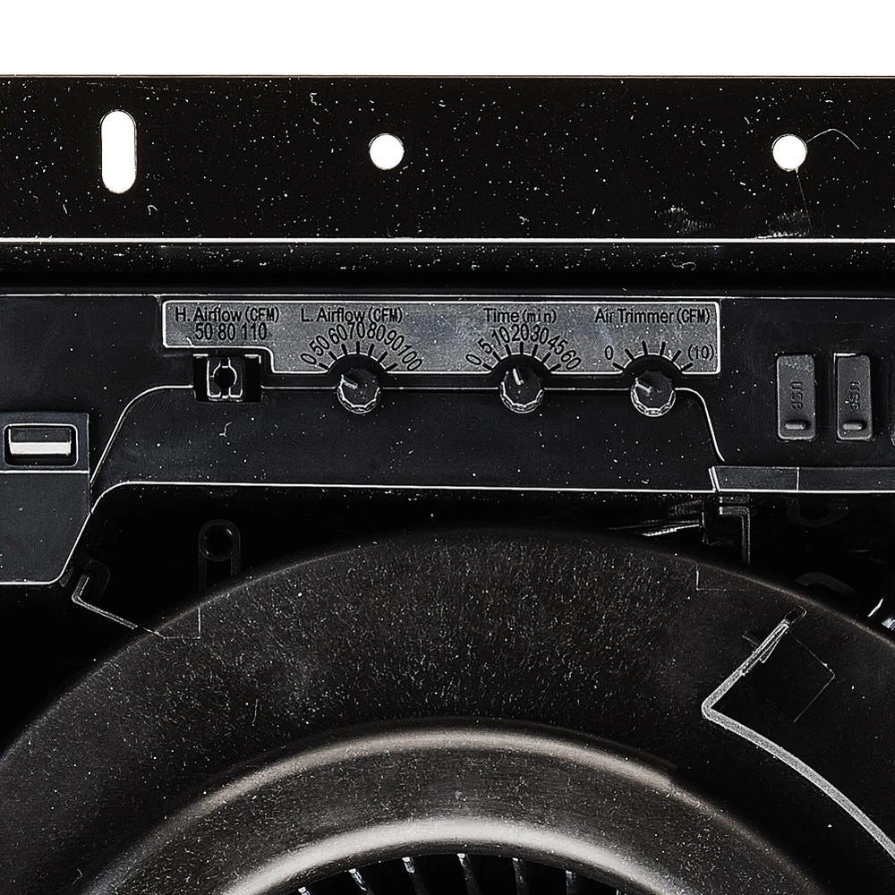 Airflow is achieved through an energy-efficient brushless DC motor. A high flow speed of 50, 80, or 110 CFM and a continuous lower speed can be set using switches in the fixture. The humidity sensor can activate high airflow when humidity rises above a level set by the user (50-100%), and a motion sensor activates the fan when someone enters the room.