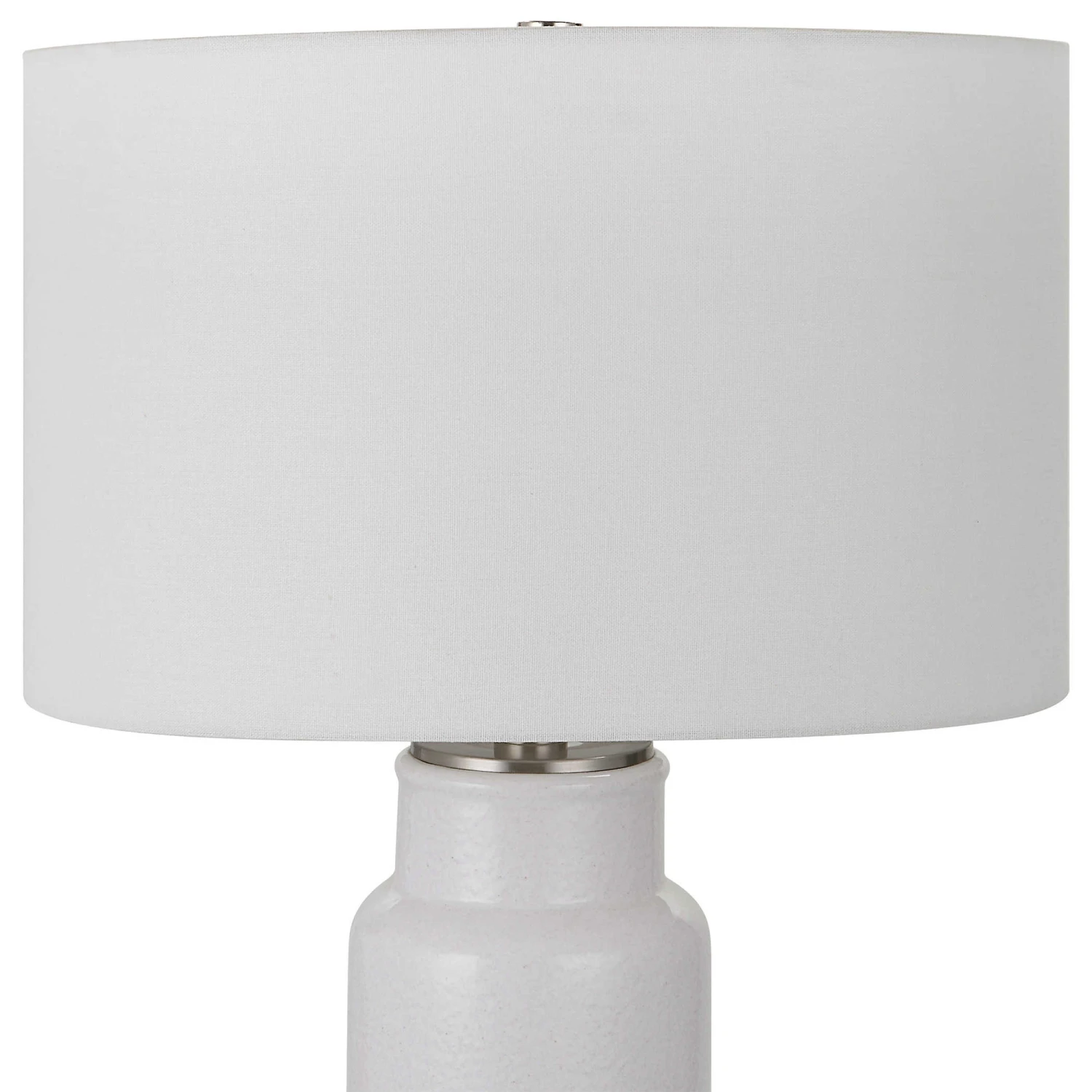 The Albany Table Lamp is inspired by farmhouse style pottery and is handcrafted from ceramic finished in a textured white glaze with a natural bottom, paired with plated brushed nickel accents. A white drum shade complements this piece. 3-way switch on socket.