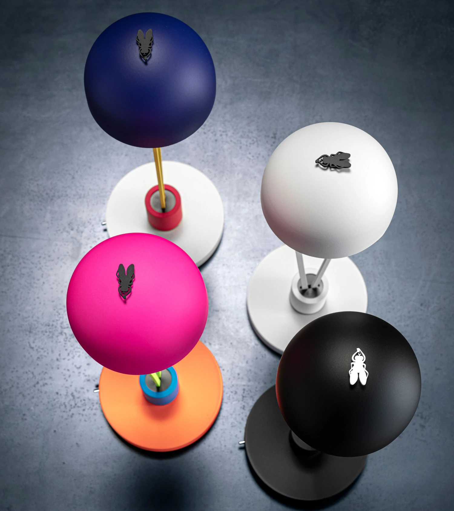 The Ale Portable Table Lamp is a rechargeable, battery-powered lamp, allowing it to be moved anywhere additional lighting is needed. The integrated LED is housed within a dome shaped shade that can be angled to direct light. The dome is accented with a small detail of a fly for an intriguing touch. On/off switch located on base.
