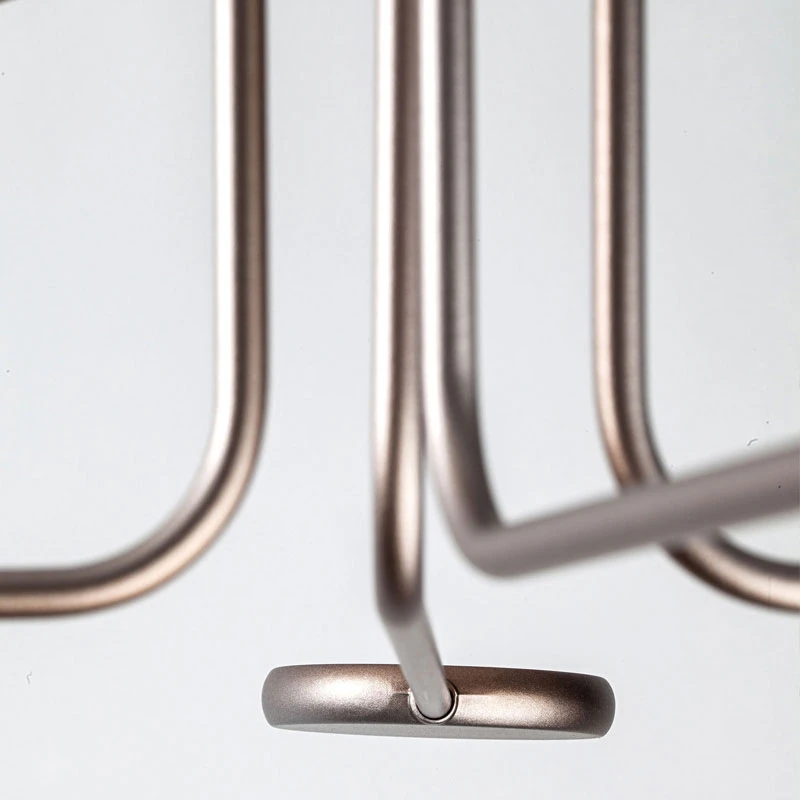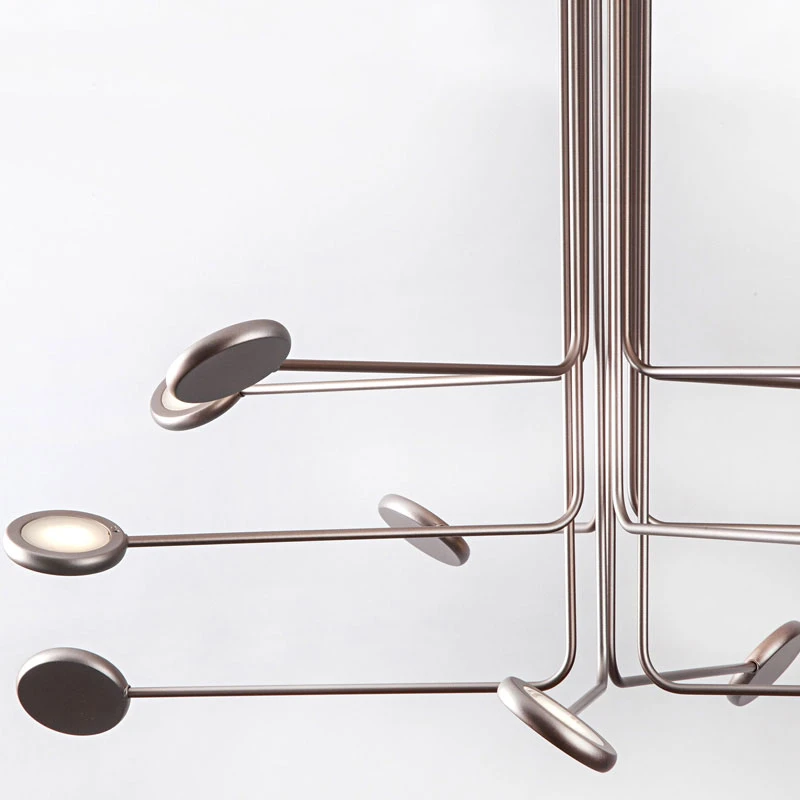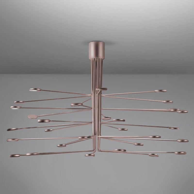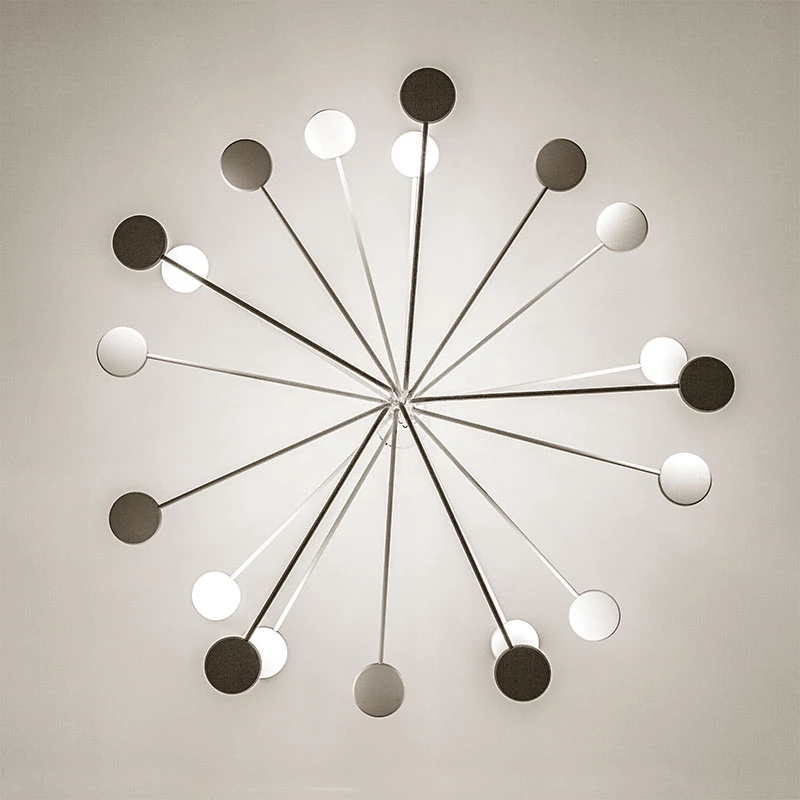 The Arbor Long Stem Semi-Flush Ceiling Light features metal arms holding round rotating light sources offering partial direct and indirect lighting. Available with 12, 20 or 30 lights. 120V direct wire (operates without a driver). Dimmable with a low voltage electronic dimmer, sold separately. Manufactured in Italy by Icone Lighting.