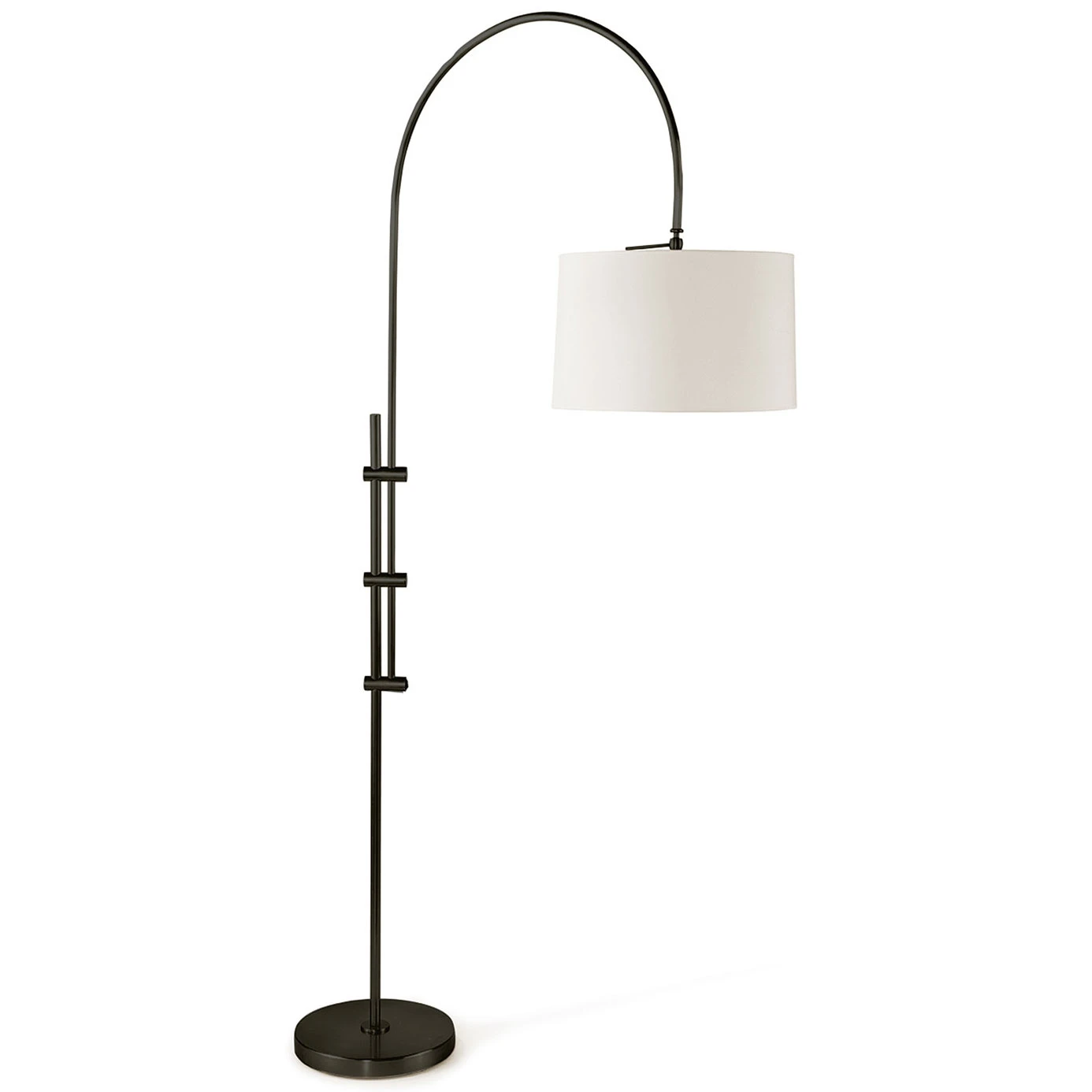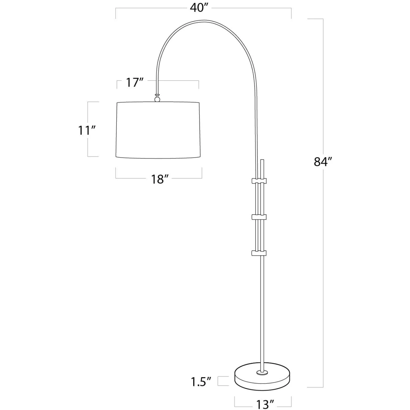 The juxtaposition of a metallic, adjustable base with a fabric shade gives this floor lamp a modern aesthetic seamlessly fusing fashion and function. Includes 8 foot clear cord. On/off switch located on post.