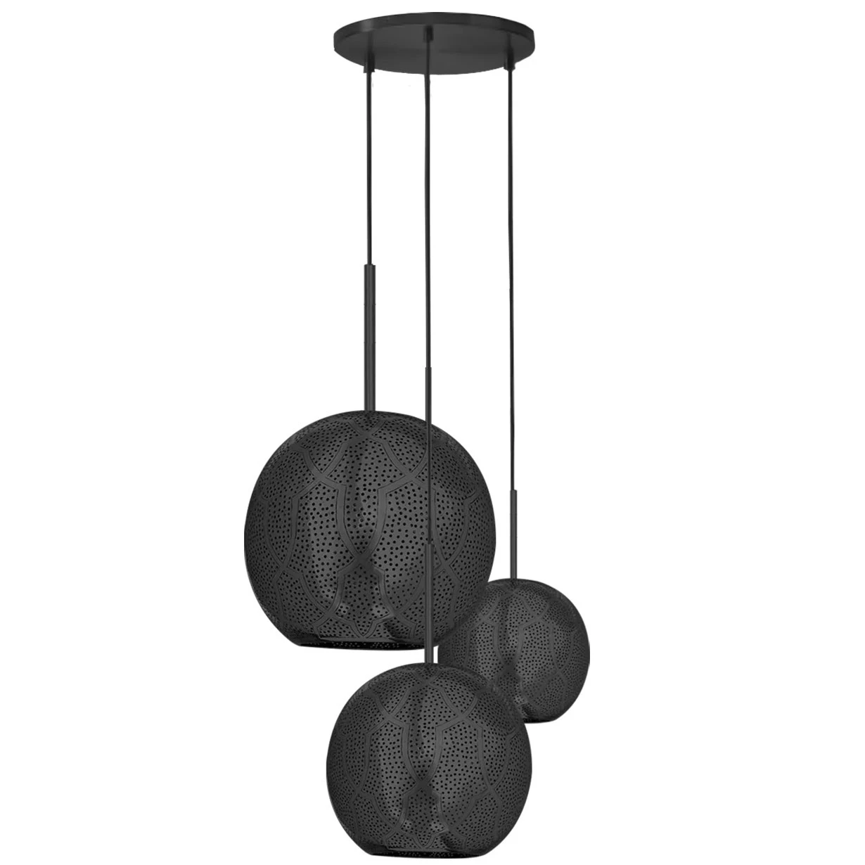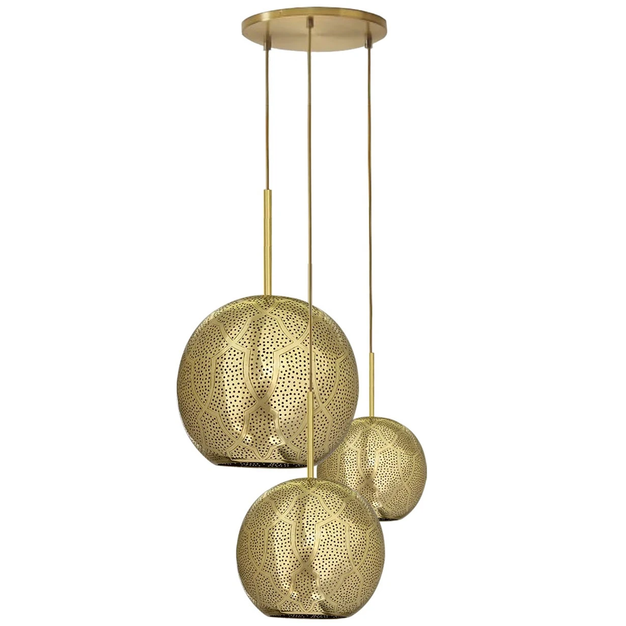 The Aria Multi Light Pendant offers a modern spin on the traditional lanterns of Morocco that will bring a luxurious, global feel to any space. Aria is handcrafted by expert artisans in Marrakech. The globe shaped shades are decorated with punched holes that create a striking pattern of light and shadow.