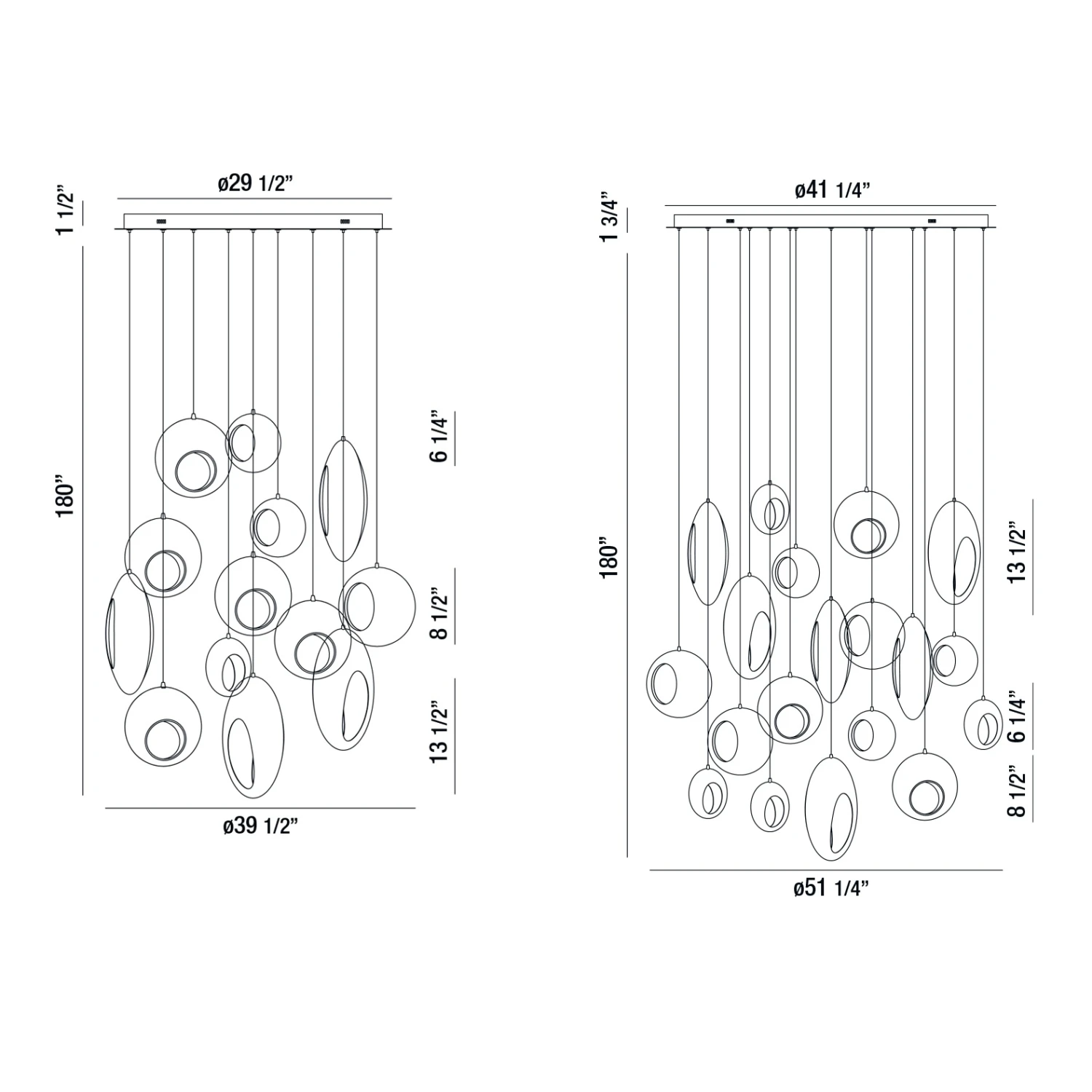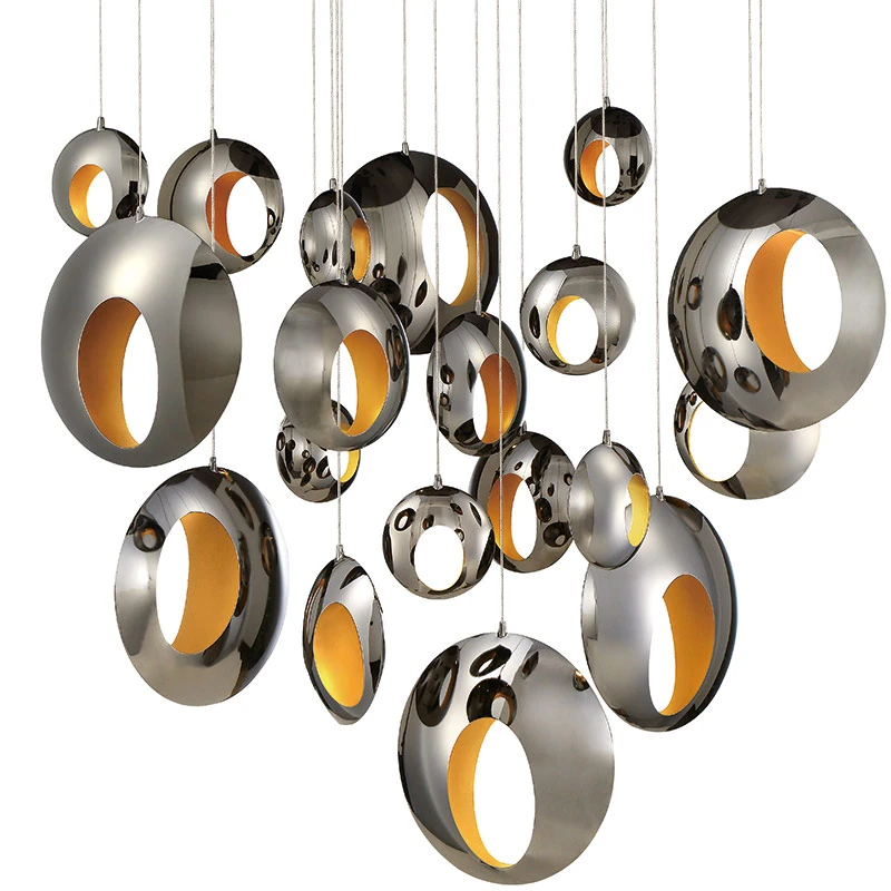 The hollowed orbs suspended on the Arlington Round Chandelier are reminiscent of molten lava, finished in Blackened Chrome and revealing golden interiors illuminated by LEDs. The effortlessly floating design adds dramatic character to your decor.