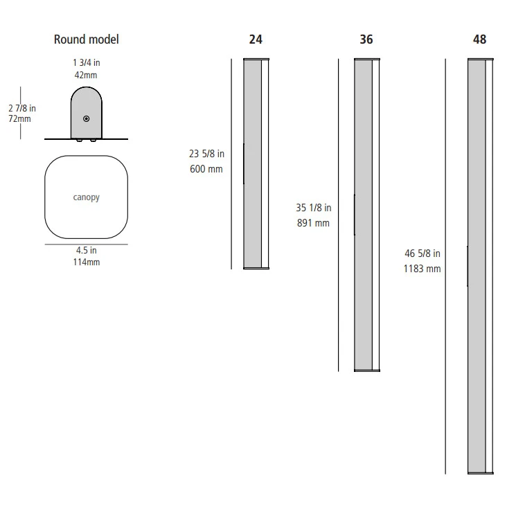 LEDBAR Round Wall / Ceiling Light features a Frosted acrylic diffuser with matte Grey end caps and round canopy. Canopy cover plate supplied for junction box mounting or removable for pigtail mounting. Three sizes available. Choice of 3000K or 3500K color temperature. Dimmable via 2-Wire dimming. Can be mounted vertically or horizontally.