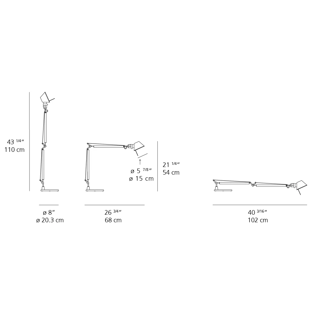 Tolomeo LED Mini Desk Lamp features a fully adjustable arm in extruded aluminum. Joints, tension control knobs, and mountings are polished die-cast aluminum and cables are stainless steel. Integrated 10 watt 120 volt LED light source. Dimmer switch incorporated on head. Diffuser rotatable 90 degrees. 8 inch base width x 21.24-43.25 inch adjustable height x 26.75 inch maximum depth x 40.2 inch maximum length. UL listed.
