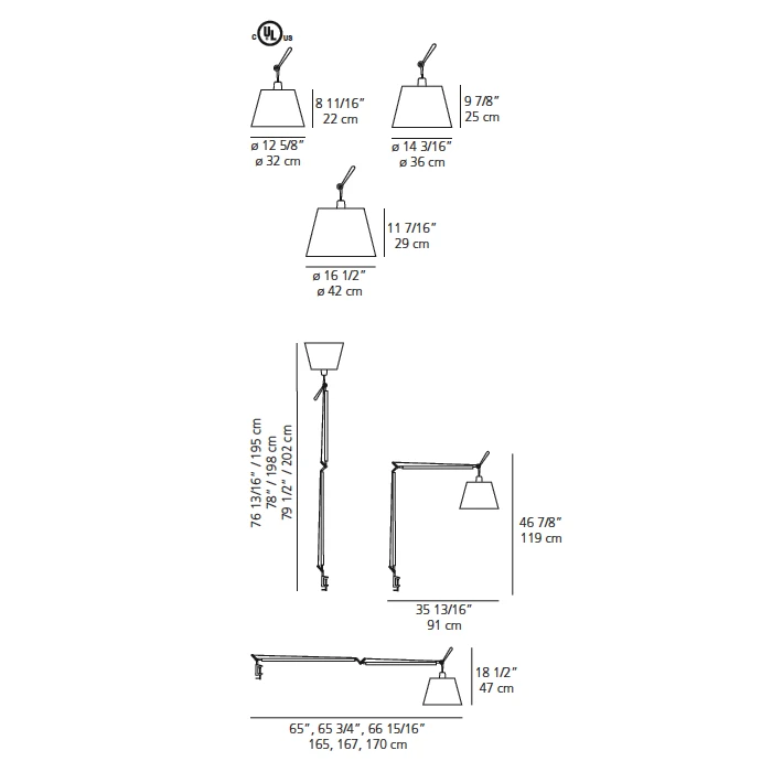 Tolomeo Mega LED Table Lamp with Clamp features a fully adjustable, articulated arm. Joints, tension control knobs and mountings in polished die-cast aluminum, support cables in stainless steel, and clamp in die cast aluminum with a 2 inch maximum opening. Aluminum frame with a polished aluminum finish and a parchment paper, black fiber or pale grey satin and polycarbonate fiber blend shade. Available in three sizes. Integral 31 watt LED. Dimmer on body. Small: 12.6 inch width x 8.7 inch height shade x 65 inch overall length. Medium: 14.8 inch width x 9.9 inch height shade x 65.75 inch overall length. Large: 16.5 inch width x 11.4 inch height shade x 66.9 inch overall length. UL listed.