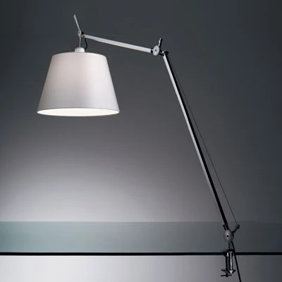 Tolomeo Mega Task Lamp with Clamp features a Grey Fiber, Black, or Parchment paper shade with a polished aluminum finish and a fully adjustable, articulated arm. Joints, tension control knobs, and mountings in polished die-cast aluminum, support cables in stainless steel. Clamp in die-cast aluminum with a 2 inch maximum opening. Dimmer included on cord. Three shade sizes available. Two 150 watt max 120 volt medium base bulbs are required, but not included. Shade available in 12.6 inch, 14.1 inch, or 16.5 inch diameter. UL listed.