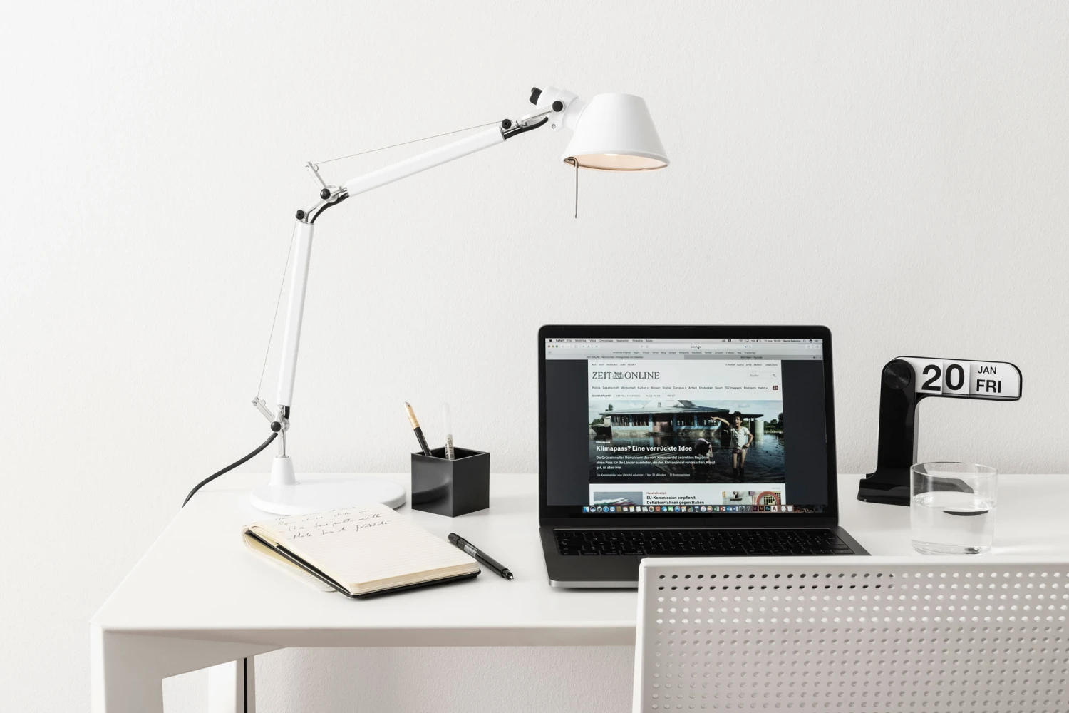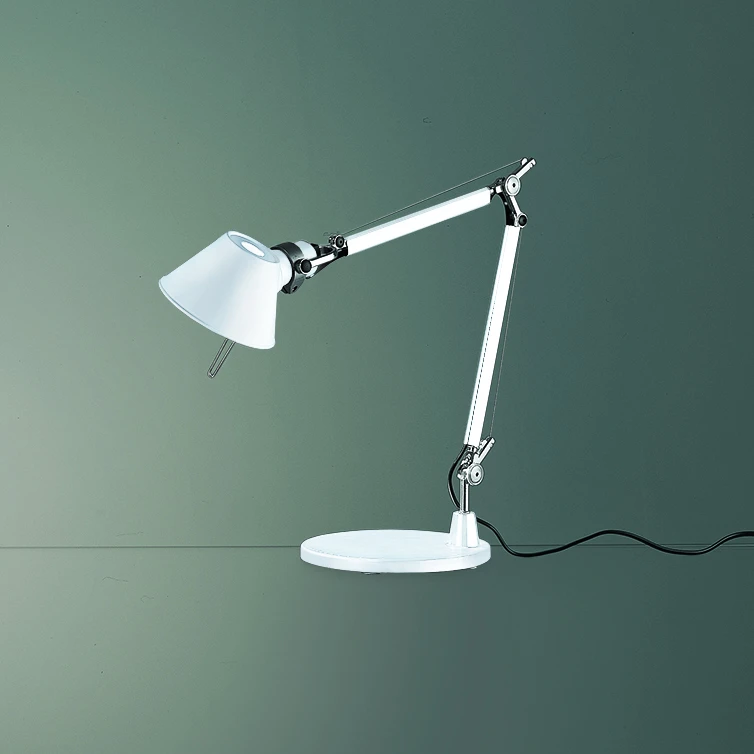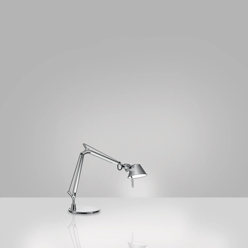 Tolomeo Micro Desk Lamp features a White, Black, or Aluminum finish. 6.75 inch round table base with a fully adjustable articulated arm structure in extruded aluminum, joints and tension control knobs in polished die cast aluminum, and tension cables in stainless steel. Diffuser is tiltable and rotatable 360 degrees. On/Off switch on cord. One 60 watt max 120 volt G16.5 candelabra base bulb is required, but not included. 17.5 inch depth x 14.6 inch height x 28.75 inch maximum arm length. UL listed.