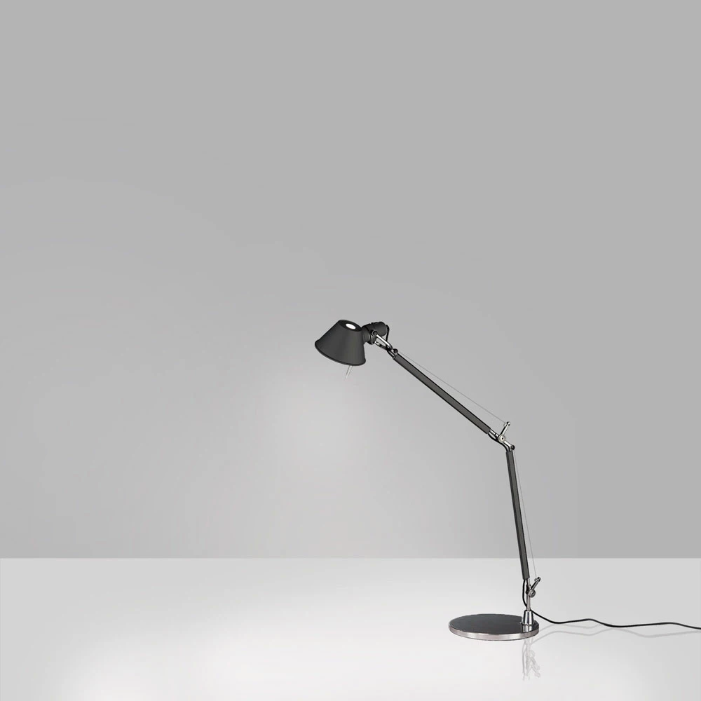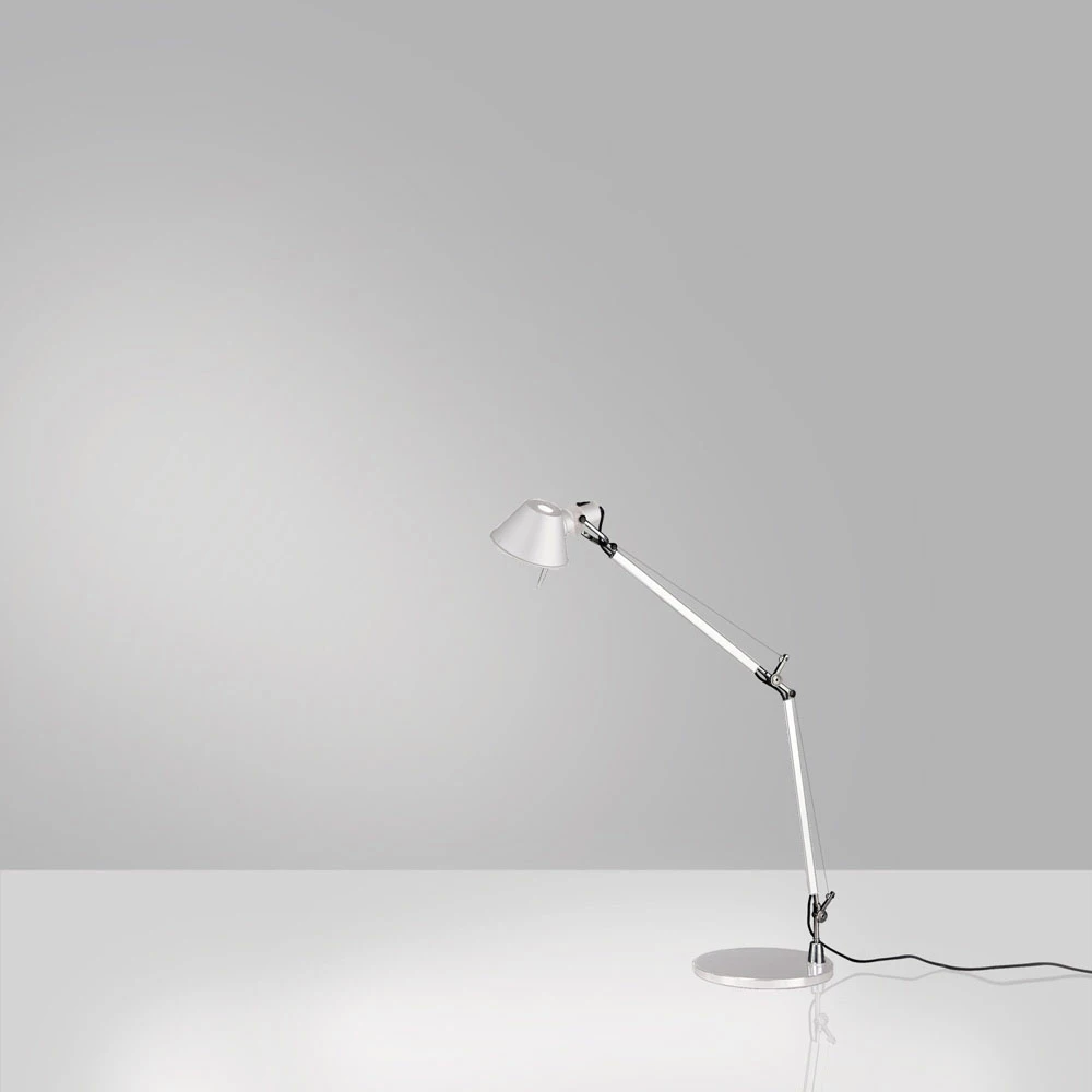 Tolomeo Mini Desk Lamp features a fully adjustable arm in extruded aluminum. 6 inch diameter diffuser is made of anodized matte aluminum and is tiltable and rotatable 360 degrees. Available in Aluminum, Black, or White; all with an Aluminum base. One 100 watt max 120 volt medium base bulb is required, but not included. 26.75 inch depth x 21.25 inch height x 40.2 inch maximum arm length. UL listed.