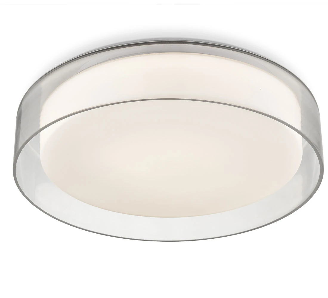 The Ashton Flush Mount Ceiling Light features Clear round aesthetic glass, casting warm shadows across your room. Opal glass cylindrical diffuser. Powder-coated White steel ceiling plate.