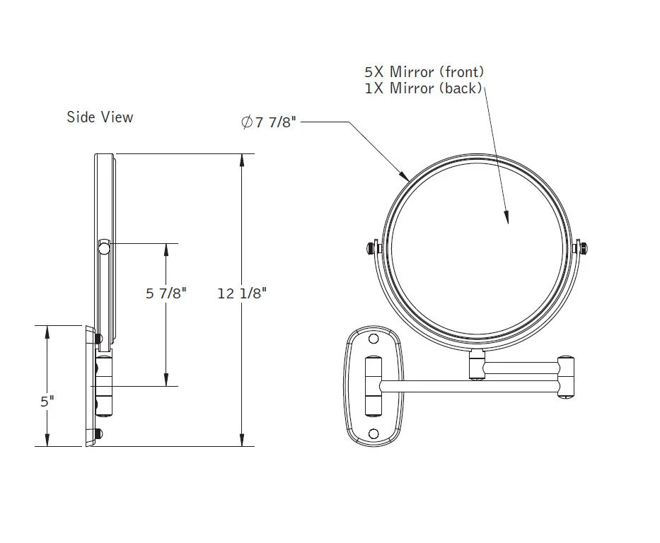 The Baci Basic 1X/5X Double Arm Wall Mirror has a solid brass construction. Features an optical quality 5x magnification glass mirror on one side and a 1x mirror on the other. Available with a Bronze or Chrome finish. Damp location rated.