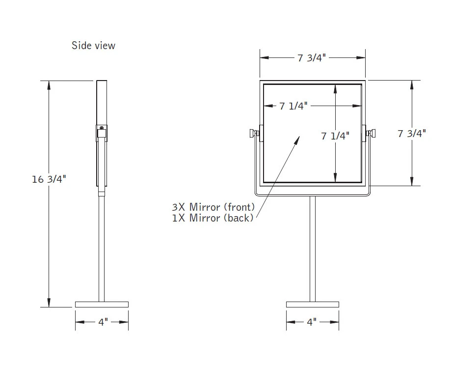 Baci Basic Square 1X/3X Reversible Vanity Mirror has a solid brass construction. Features an optical quality 3x magnification glass mirror on one side and a 1x mirror on the other. Height is adjustable to your desired position. Available with a Chrome finish.