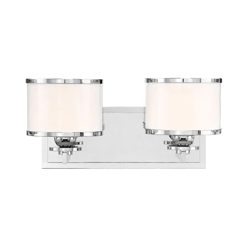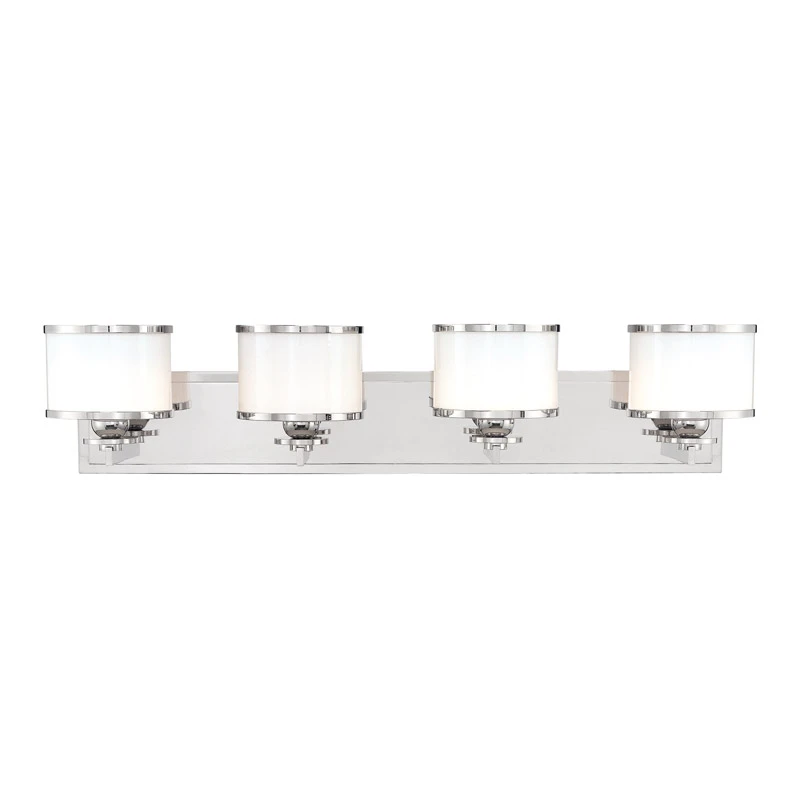 The Basking Ridge Bath and Vanity features a clean modern design with a nickel trim in either polished nickel or satin nickel finishes with white glass canister shades.