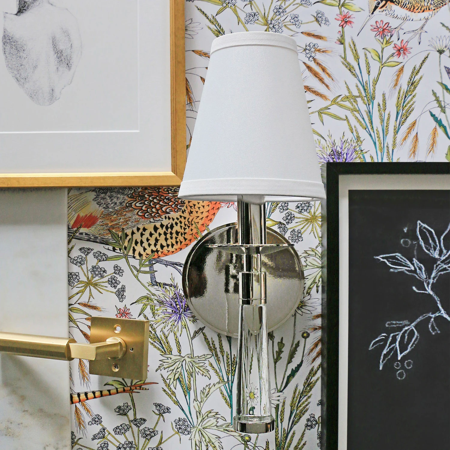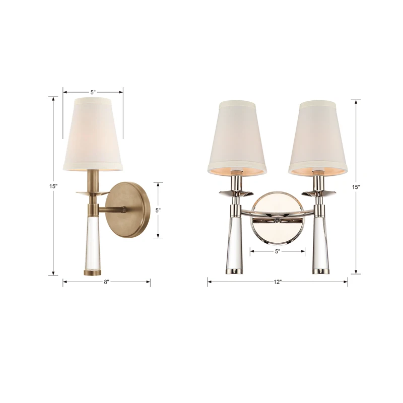 The Baxter Wall Light offers the extra details that make this wall light a perfect fit in most decors. Features White Silk shades that top off the Polished Nickel or Aged Brass with Clear acrylic as an extra touch. Available in a one or two light option. UL listed.