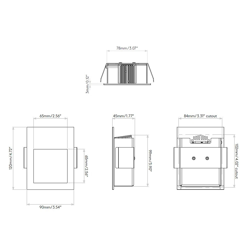 The Borgo 90 Recessed Step/Marker Light features a slim vertical profile. One 2 watt, 3000K color temperature LED module is included. Wall cutout: 4.02 inch height x 3.31 inch width. Recess depth: 1.65 inch. ETL listed. Required LED driver and recessed wall box sold separately. Dimmer type dependent on driver selected.