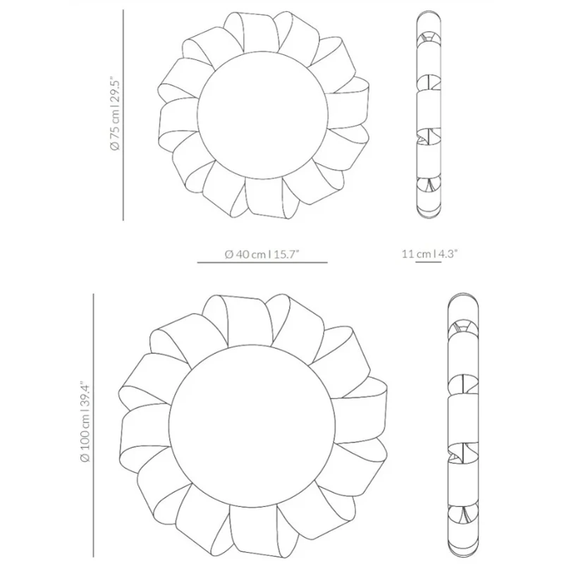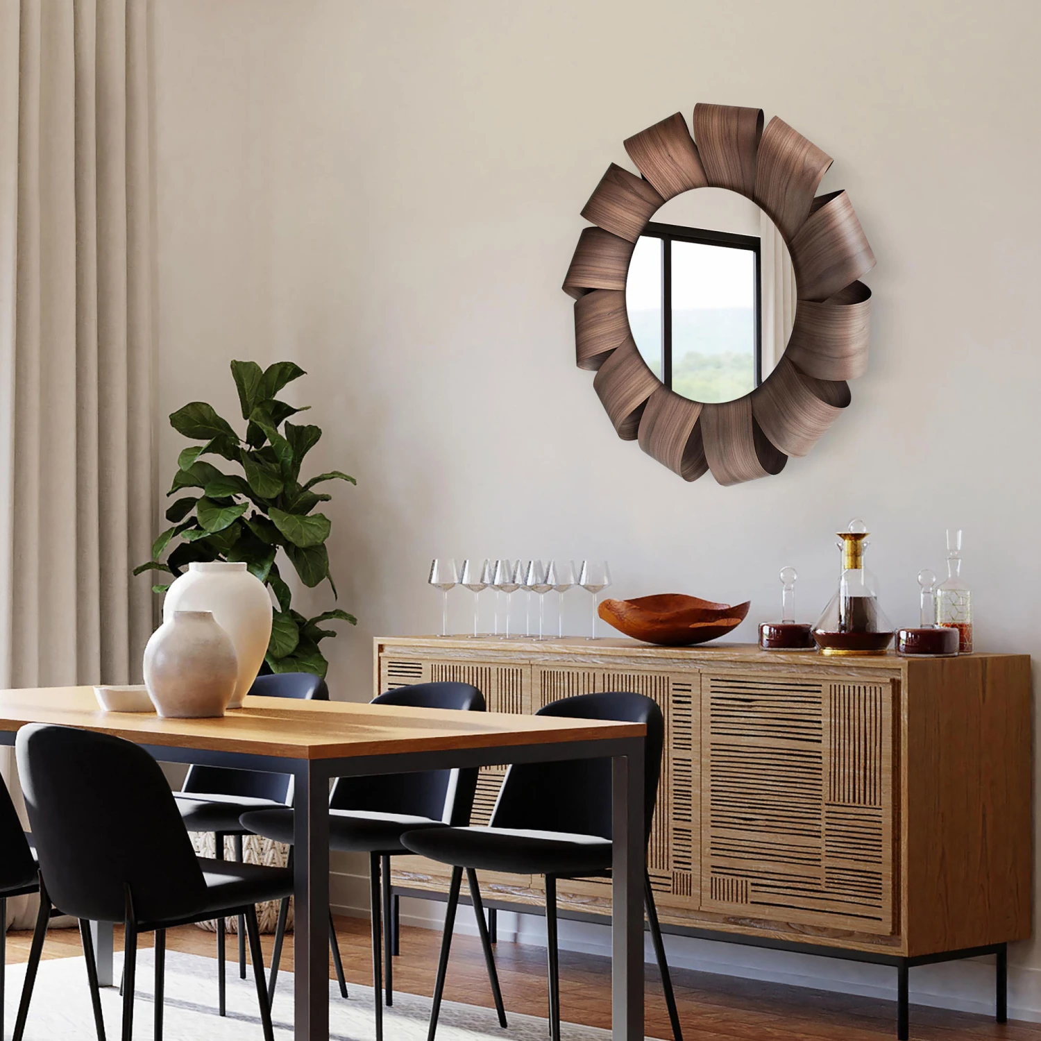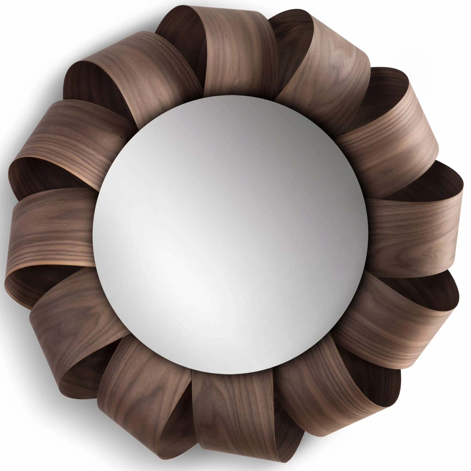 The Brisa Mirror features a wooden flower-shaped frame made of natural walnut leaves folded in a three dimensional shape with a Silver or Bronze mirror finish.