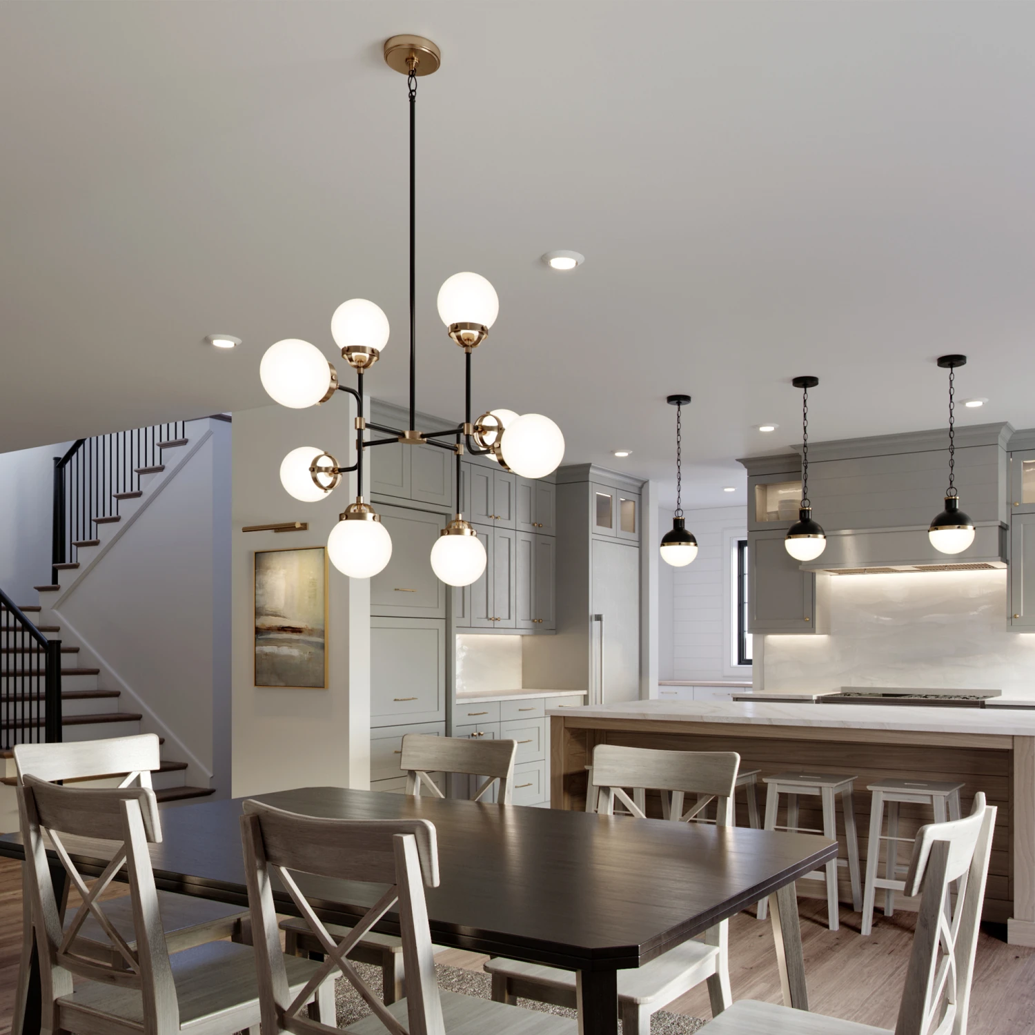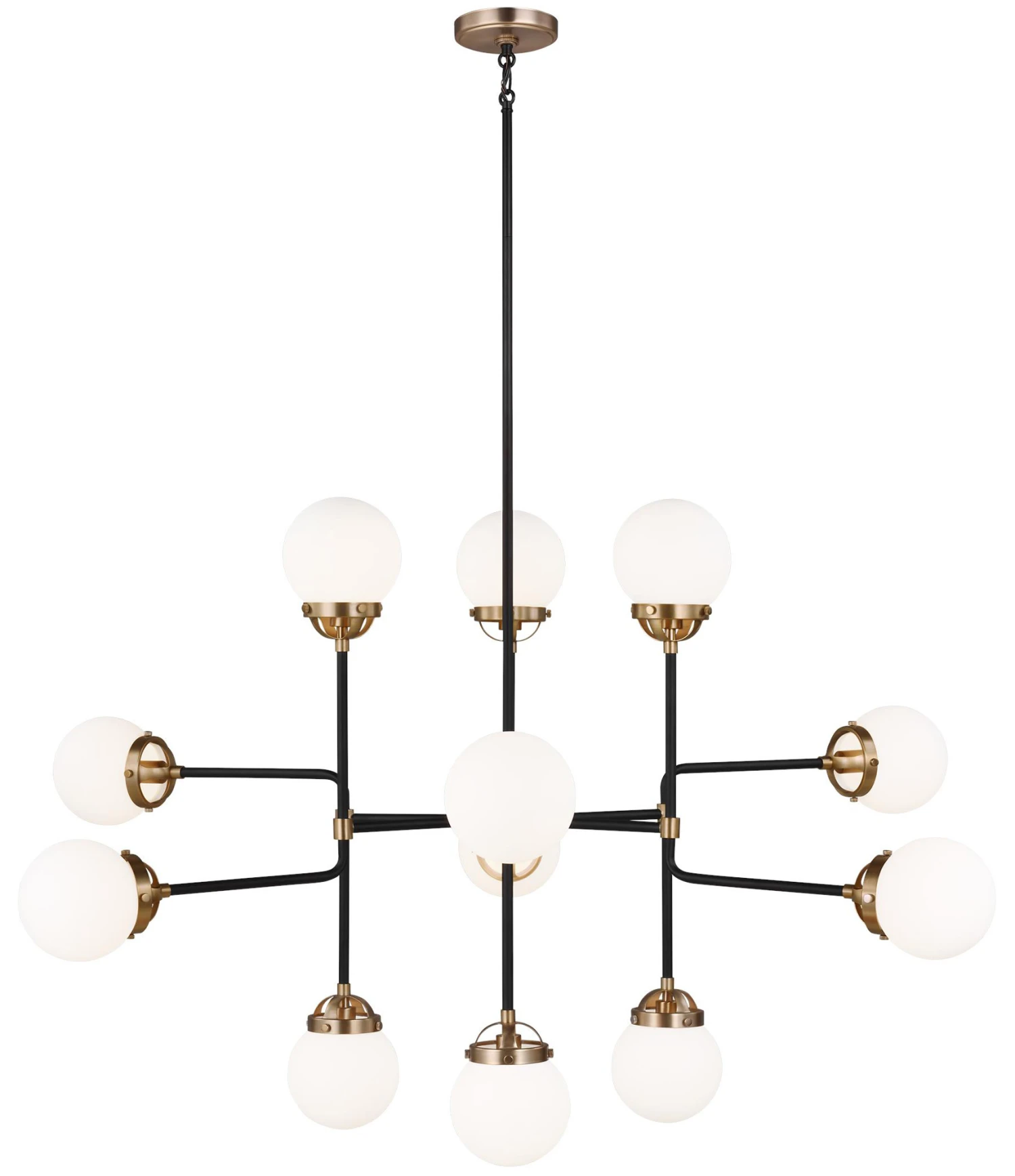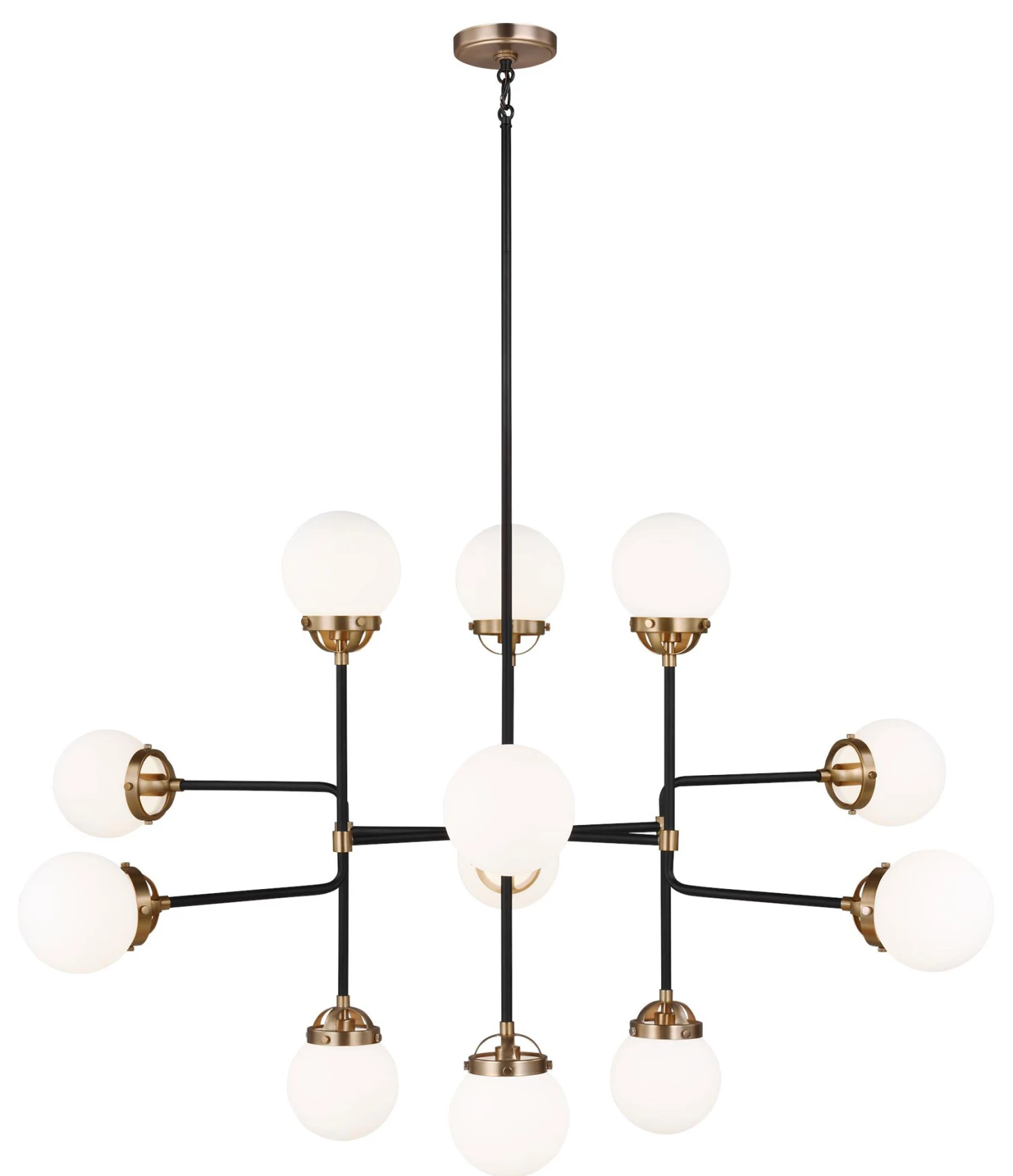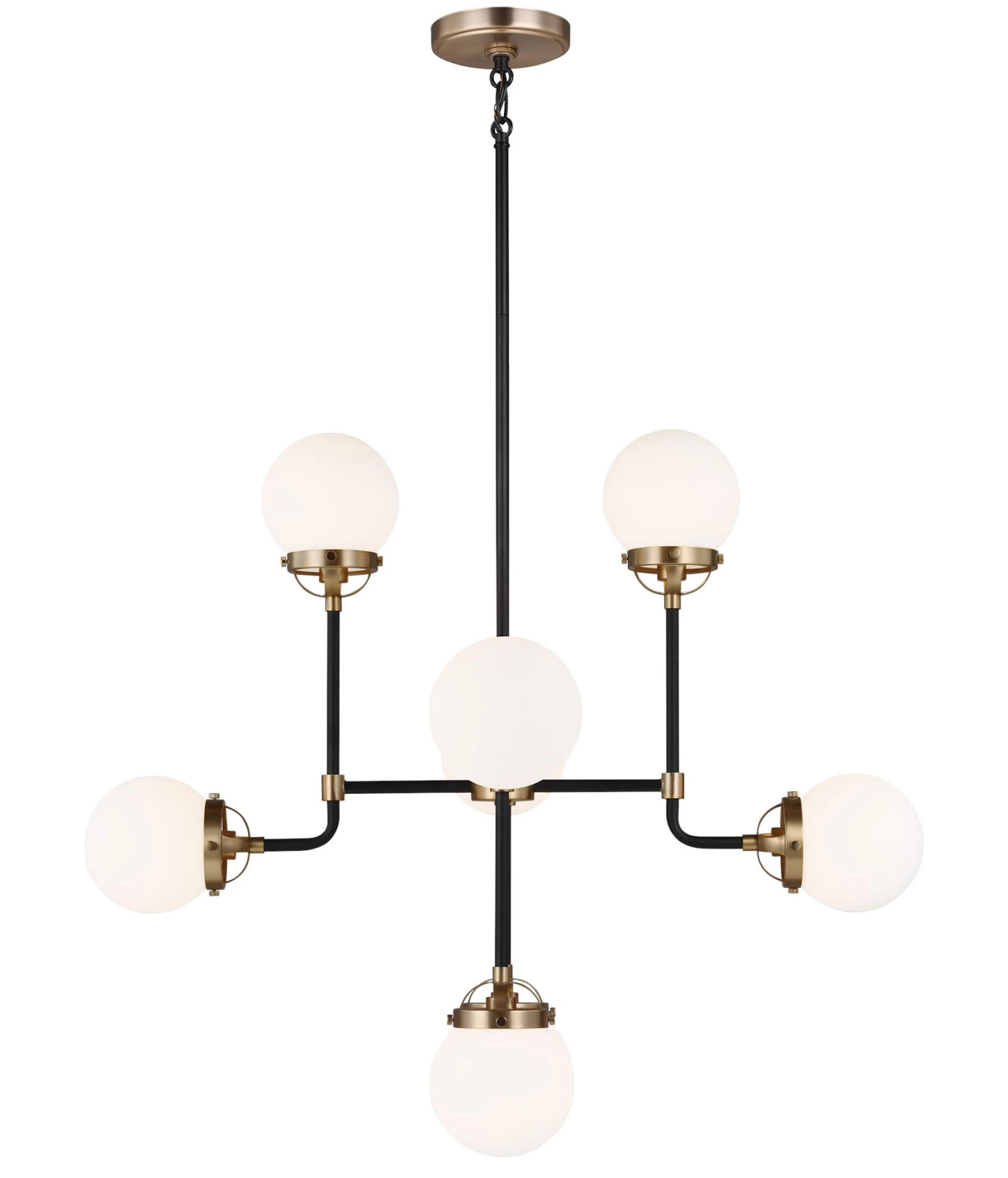 The Cafe Chandelier brings a clean detailed look to a variety of interior styles. Globe shaped Etched White glass is complemented by a finish in Satin Brass with Midnight Black arms. Available with Incandescent or LED lamp options. LED version is Energy Star Qualified and Title 24 Compliant.