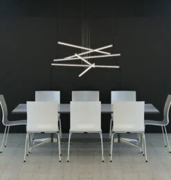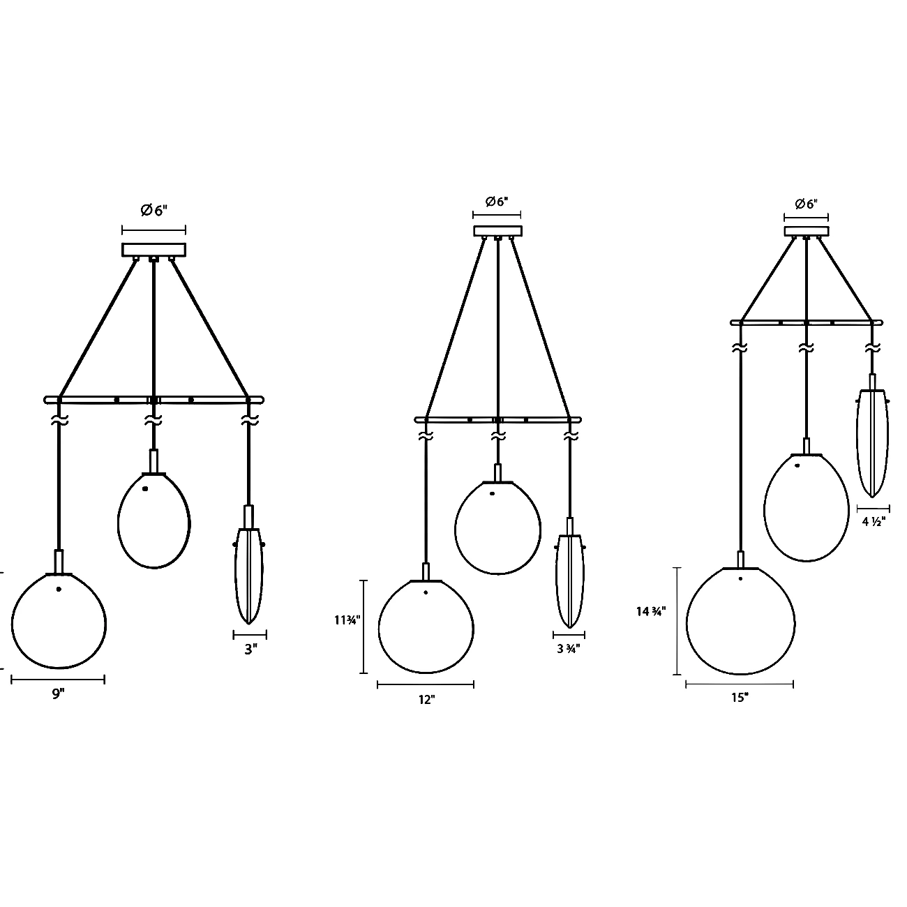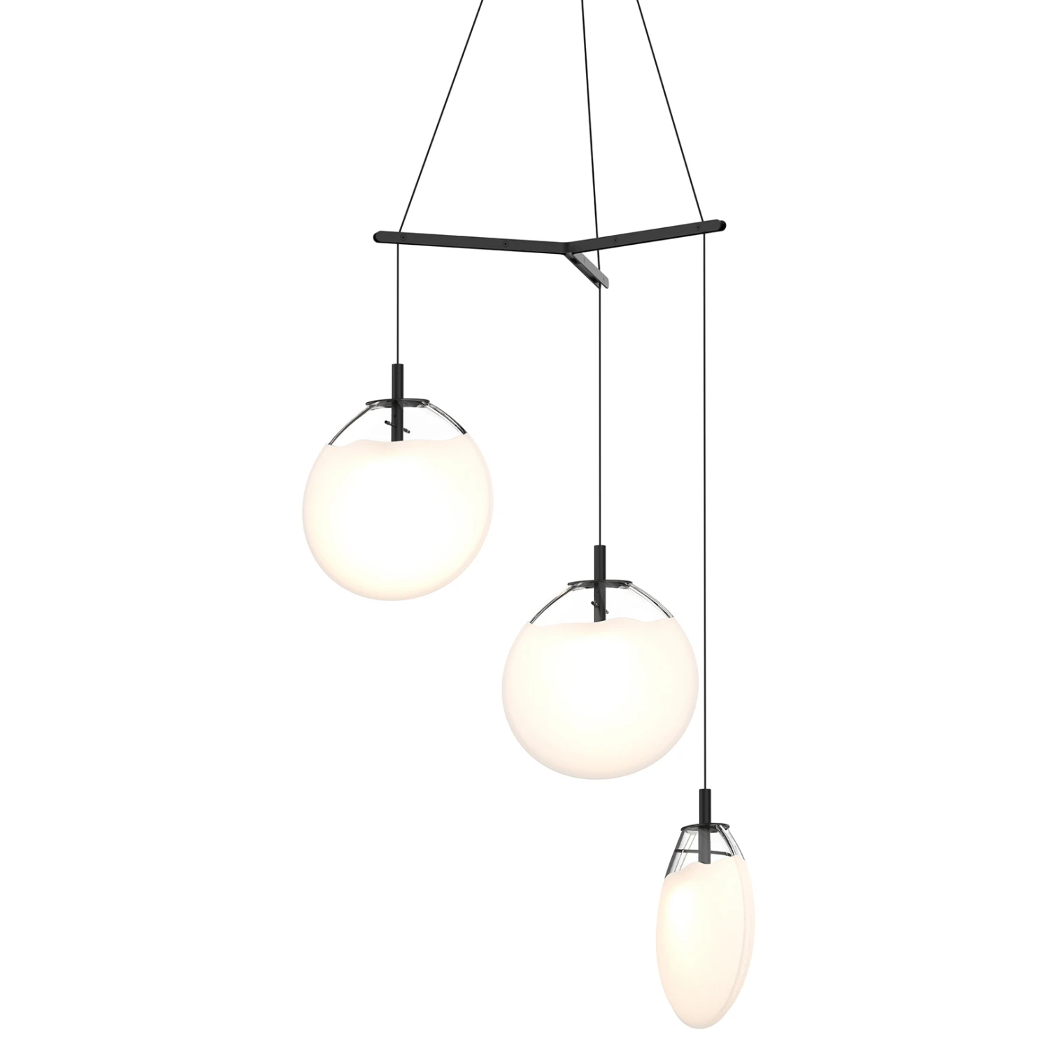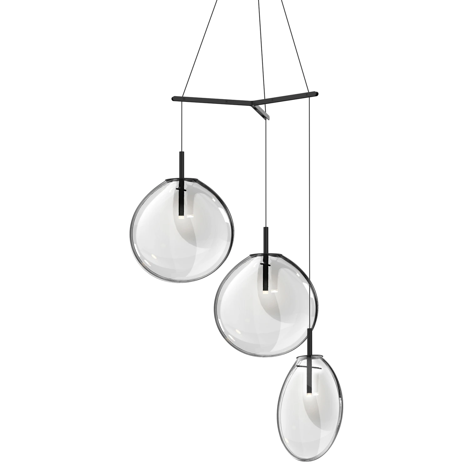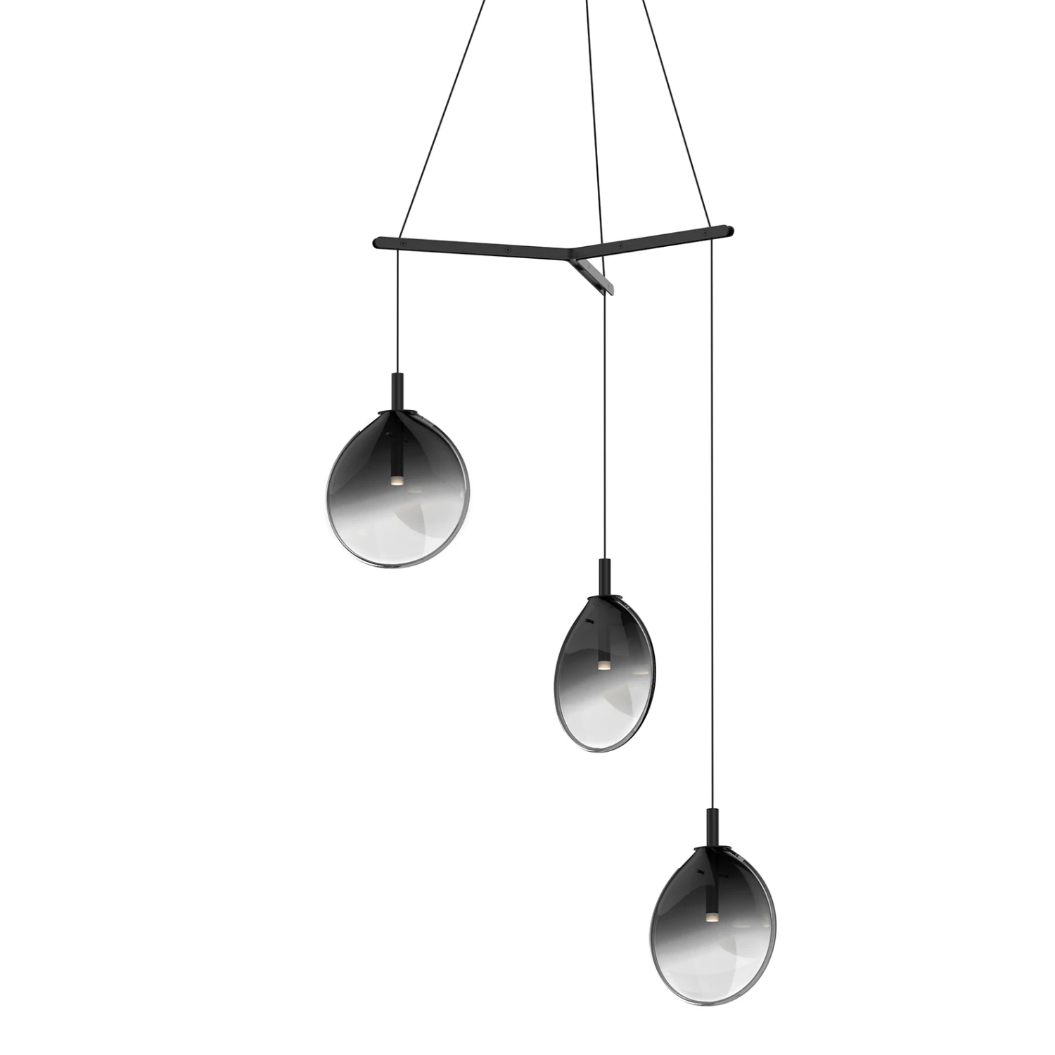 Cantina 3 Light Tri Spread Pendant has a flask-like flat oval Clear, Smoke or White glass profile, suspended from a slender Satin Black cable, that rotates randomly to various orientations creating an asymmetric relationship to its surroundings.