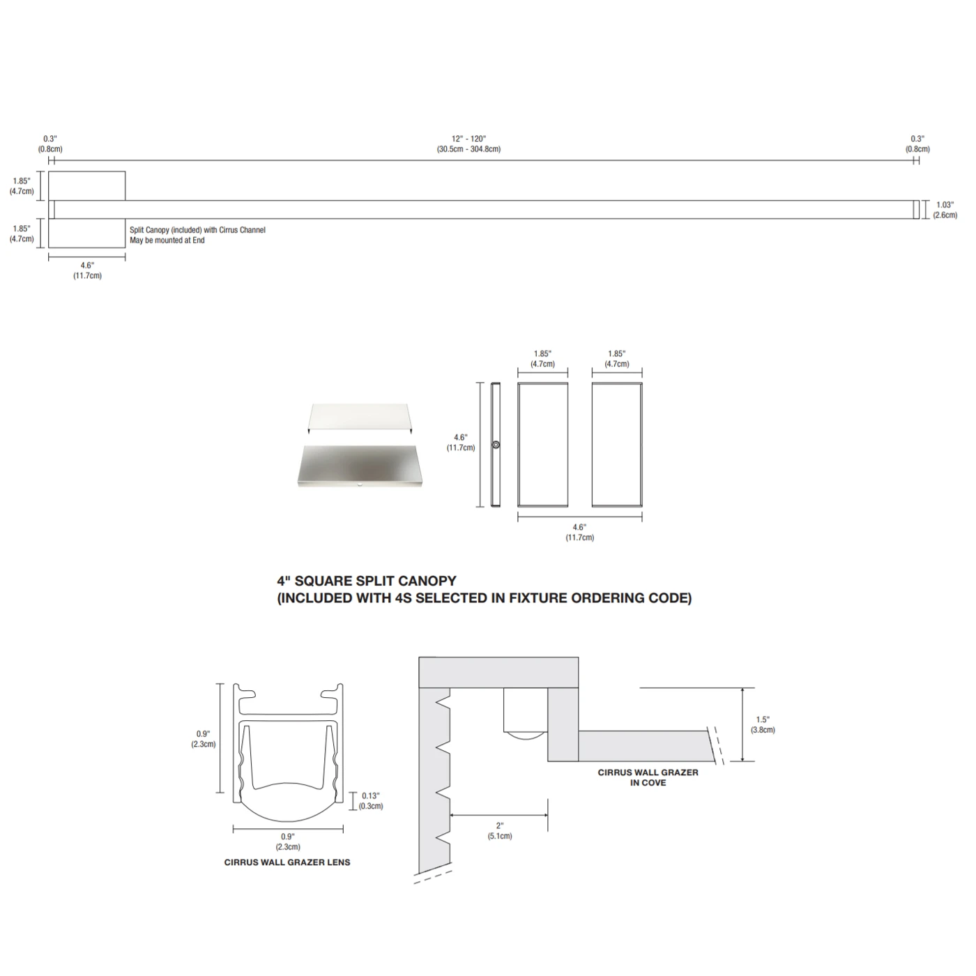 Cirrus Ceiling Channel Wall Grazer with Remote Power and a 4 inch square canopy is a linear LED fixture that brings to life undulating and textured surfaces. May be recessed in ceiling, perimeter or cove. Available in a 5 or 7 watt option in various increments from 12 to 120 inches, features a clear lens with a 10 degree or frosted lens with a 20 degree beam spread, a variety of finish options, and a spectrum of color temperatures. Chrome finish available up to 84 inch length. Ceiling lock clips (CC-MCL-L) are provided for support every 48 inches. Product is built to order.