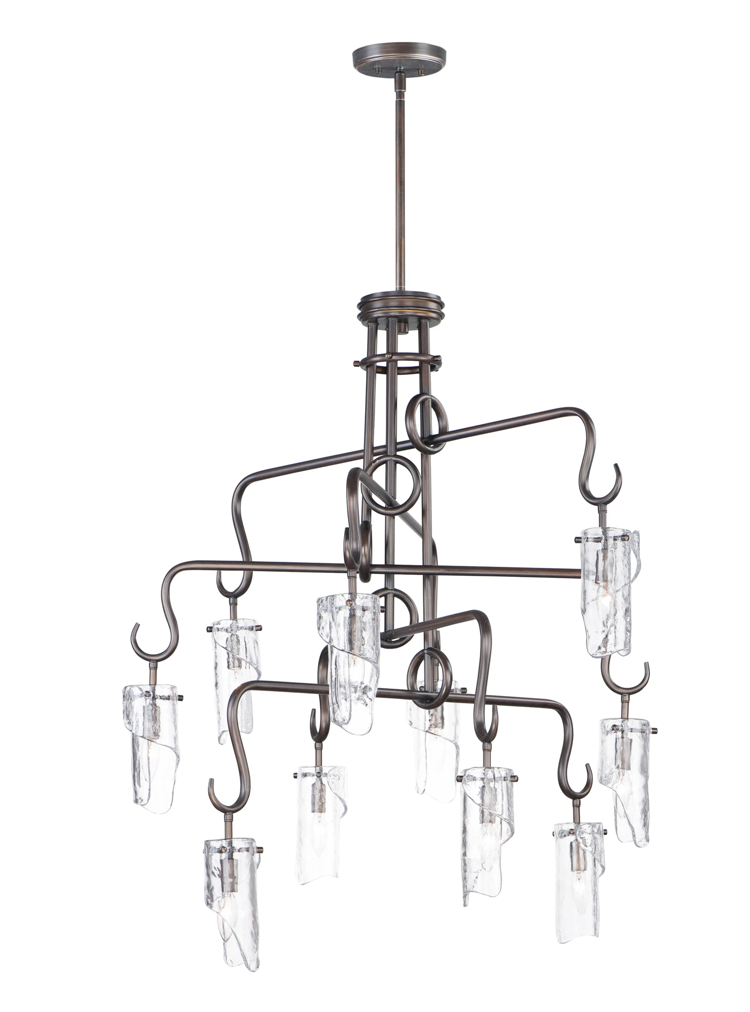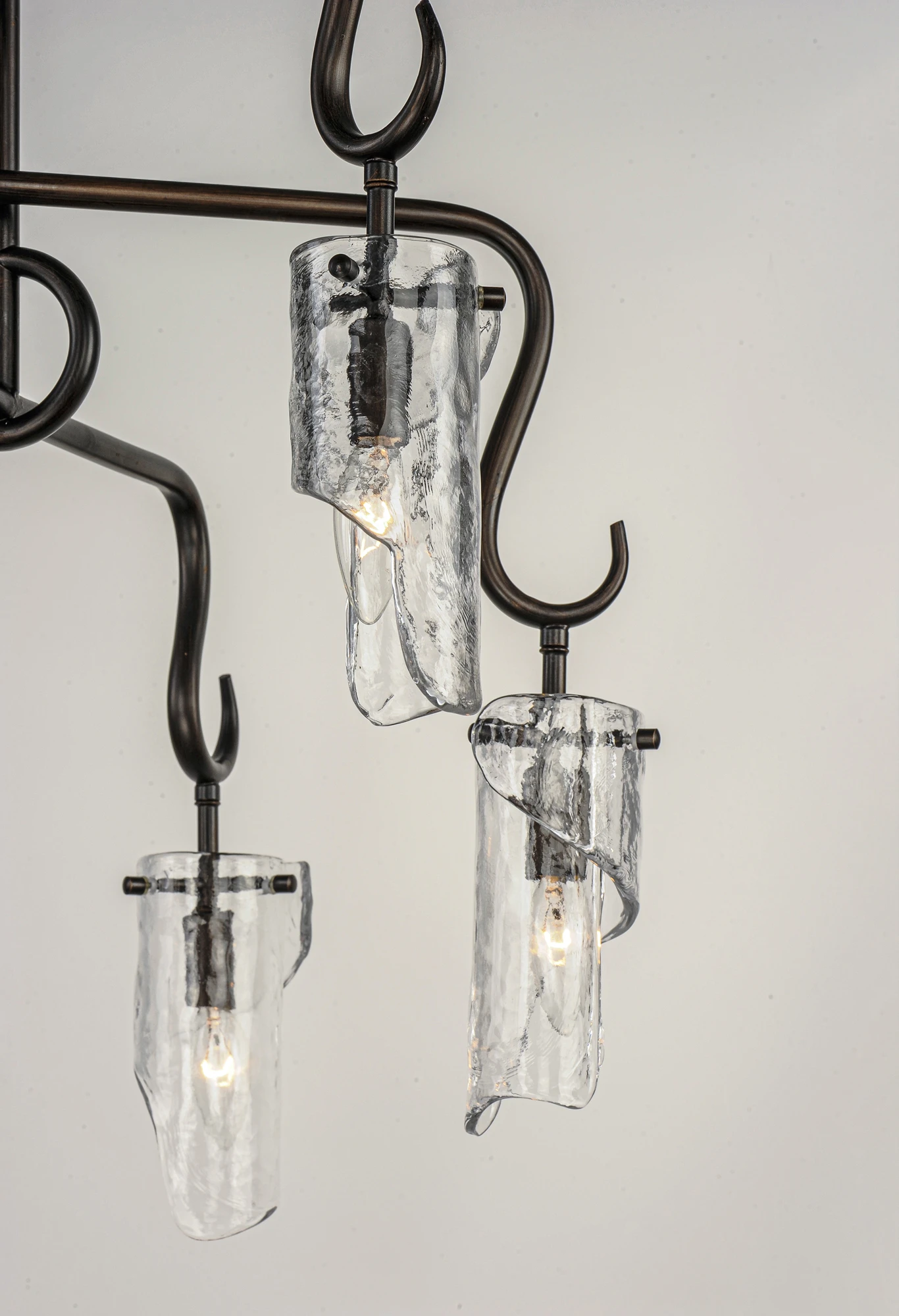 The Citadel Chandelier’s stunning design brings a work of art to your ceiling. Forged arms, finished in Chestnut Brown, are suspended in a mobile-esque manner. Hooked at the end of each arm are beautiful hand-formed Clear Piastra Glass shades, giving the Citadel a refined elegance. Place this fixture above a dining table, entryway foyer, or anyplace where a bold design is needed. Available in 6 and 10 light configuration. UL listed.