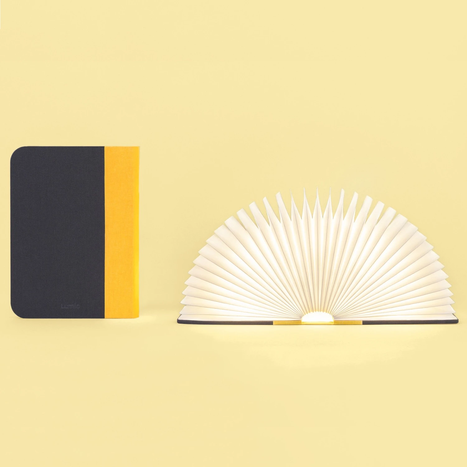 The Classic Lumio Fabric Book Light is a dynamic, multi-functional lamp that conceals itself in the form of a hard-cover book. Crafted using heavy-duty book cloth fabric, the interior of the body is made from durable, water resistant, 100 percent recyclable DuPont Tyvek. Available in Grey with a Yellow spine, Navy with a Red spine, or Green with an Orange spine. Includes custom micro-USB charger, magnetic wooden pegs for mounting, and a beautiful leather strap for hanging. A rechargeable lithium ion battery provides up to 8 hours of full charge with continual use. The high output 4.4 watt LED has a 2700K and 500 lumens, slightly brighter than a standard 40 watt bulb. When closed, 6.5 inch width x 8.5 inch height x 1.25 inch depth. Open, 13.5 inch width x 8.5 inch height x 13.5 inch depth.