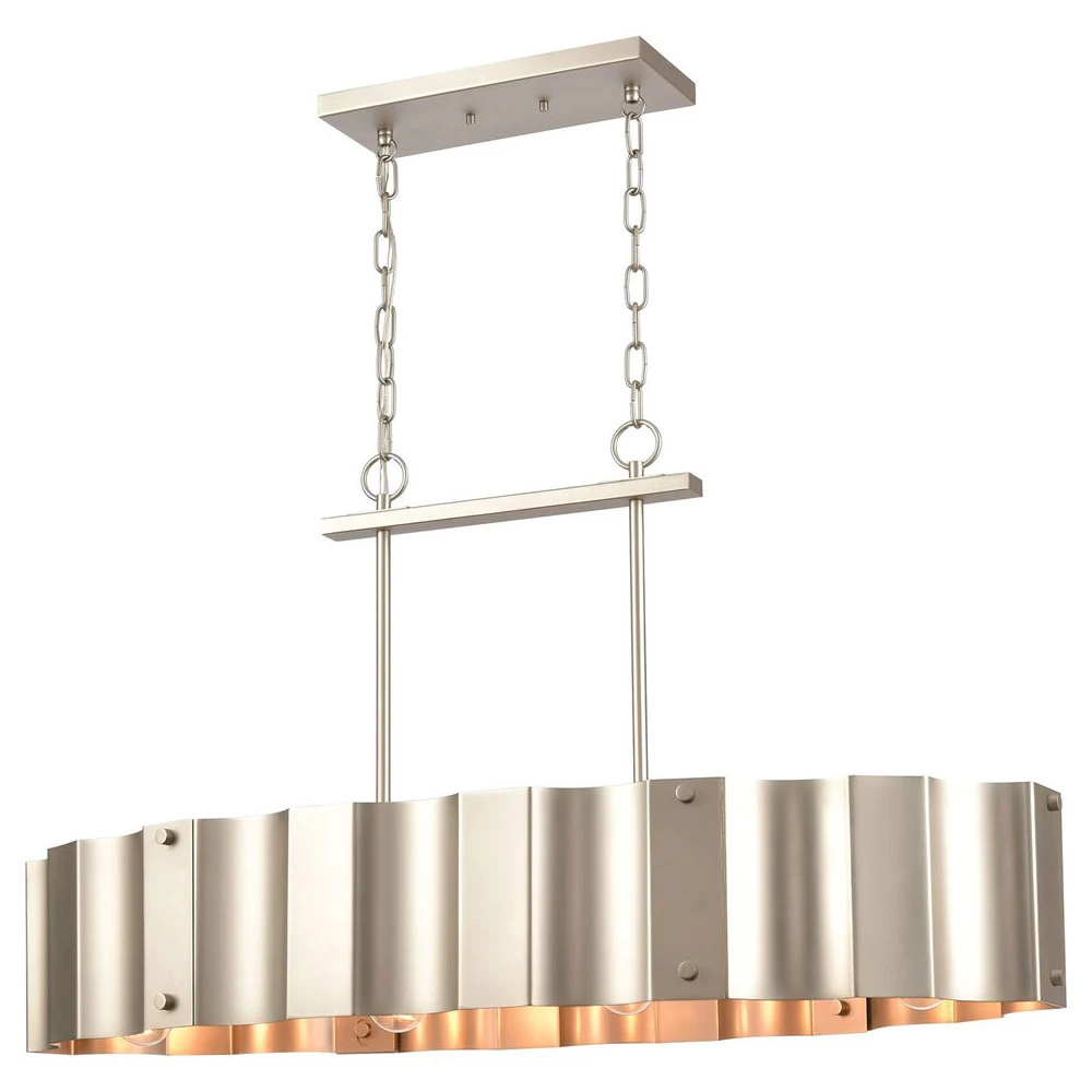 The Clausten Linear Pendant showcases an industrial design with stamped corrugated metal joined together with over-sized bolts. Great selection for over a kitchen island, dining table or gaming area. Choose from Matte Black with Gold interior, Matte Nickel or Burnished Brass finish. Ideally suited for vintage style filament bulbs. Canopy: 12 inch length x 5 inch width. UL listed.
