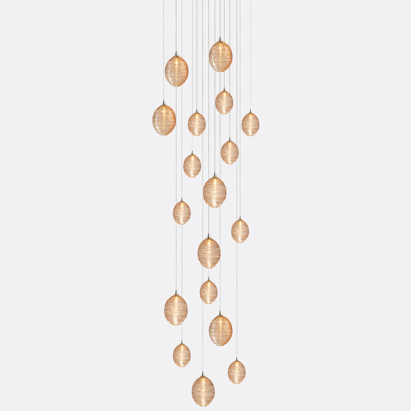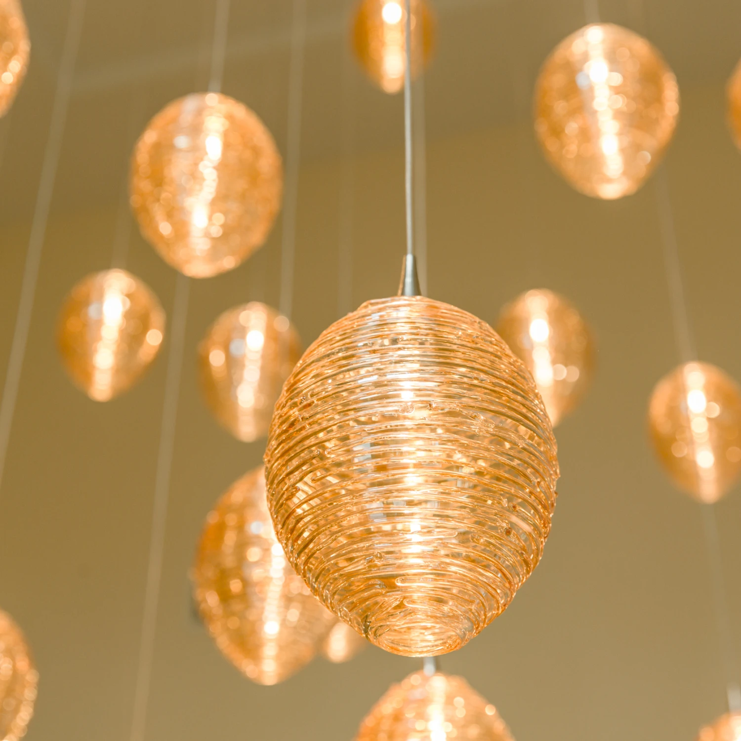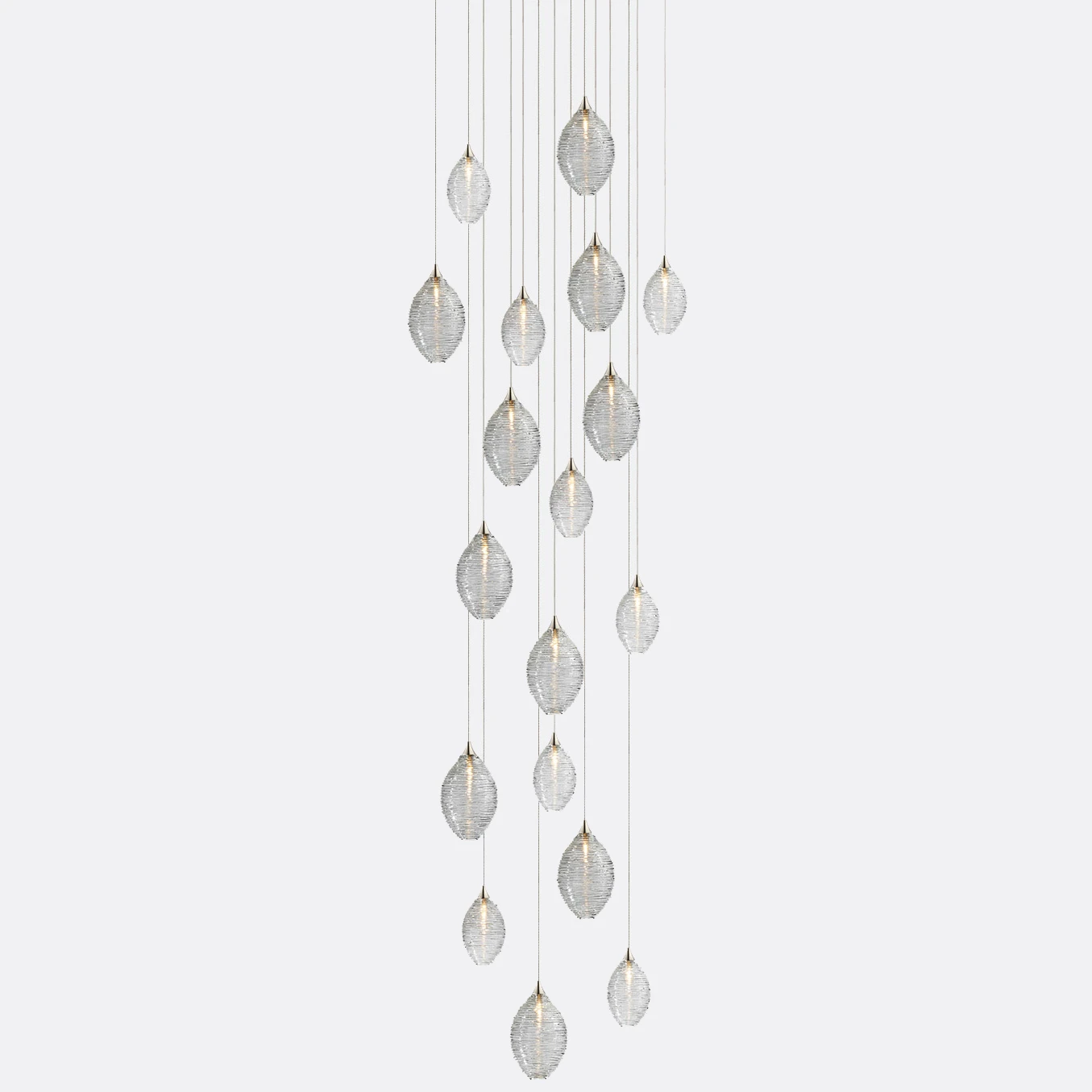 The Cocoon Square 18-Light Chandelier brings a rich textured look to your interior space. Egg shaped glass is drizzled with ropes of Clear, Amber, or Grey glass that reflects interesting light patterns across your room. Pendant hardware in Silver. Canopy finish in Matte Silver, Matte White, or Antique Bronze. Glass shades available in two sizes. Includes canopy and dimmable power supply. Canopy: 21 inch square. UL listed. Custom drop lengths are available, please contact our Sales Team for more information.