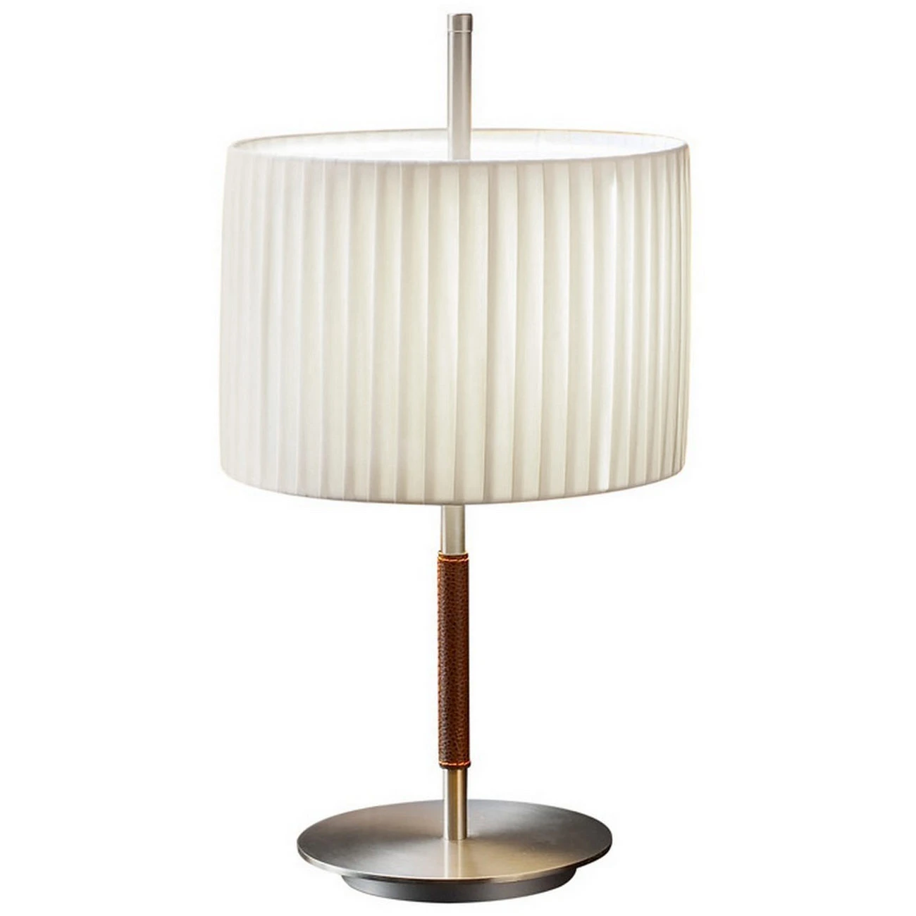 The elegant Danona Table Lamp features a slim metal body topped by a translucent ribbon or cotton drum shade. The stem is finished entirely in Satin Nickel or is accented with a decorative dark leather wrap. An upper polycarbonate diffuser softens the light. Place this lamp on a foyer console or a living room side table to add warm ambient lighting. On/off switch on cord.