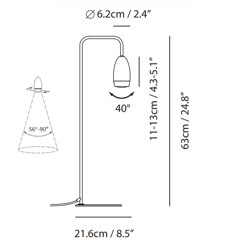 The Dawn Table Lamp is a masterpiece for you interior space. Like the suns rise at dawn, simply turn the colored optical zoom lens to create beams from 56 degrees to 90 degrees. Head can adjust 40 degrees. Matte black finish with a shiny black ring. Dimmer switch is located on the base.