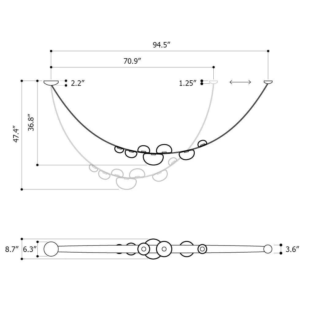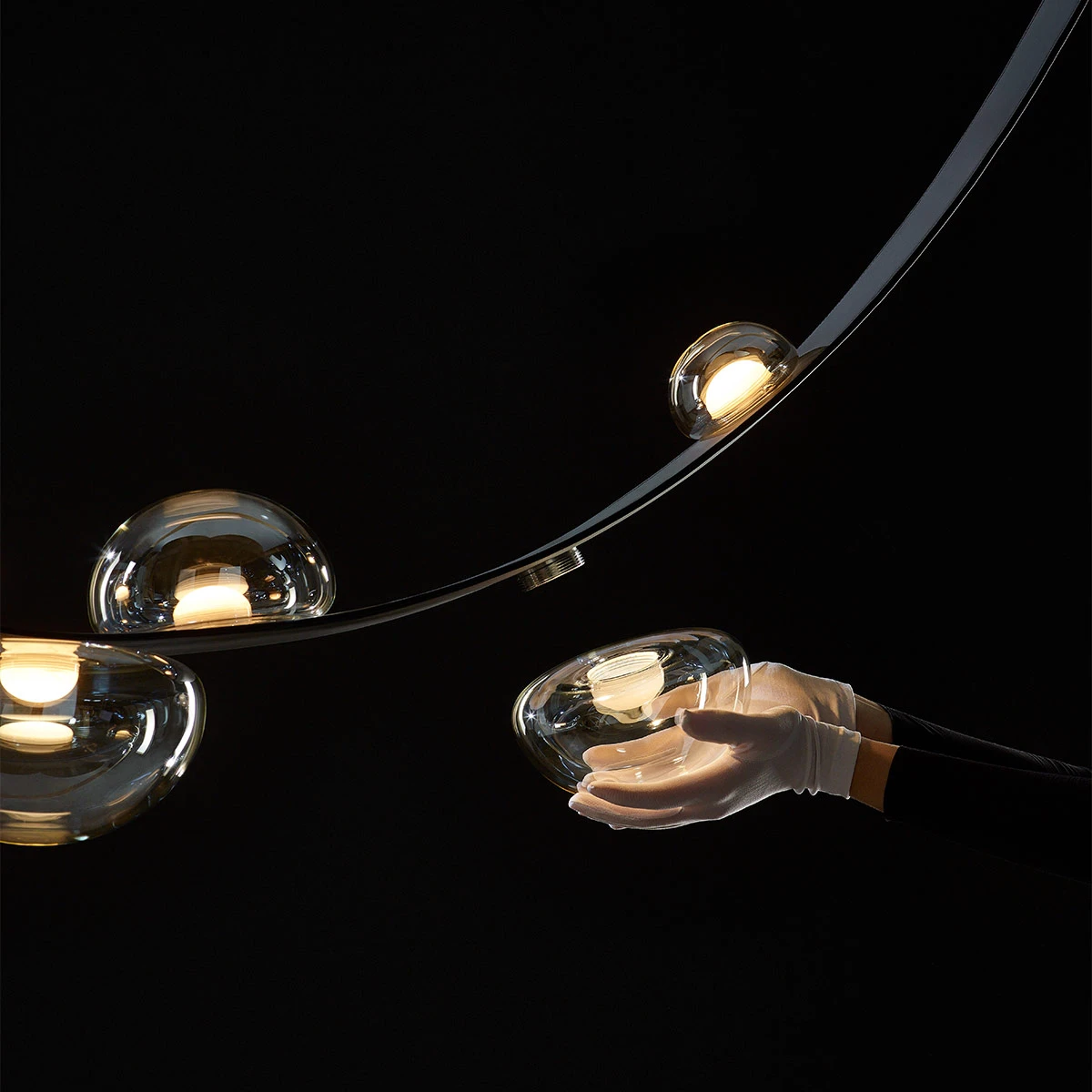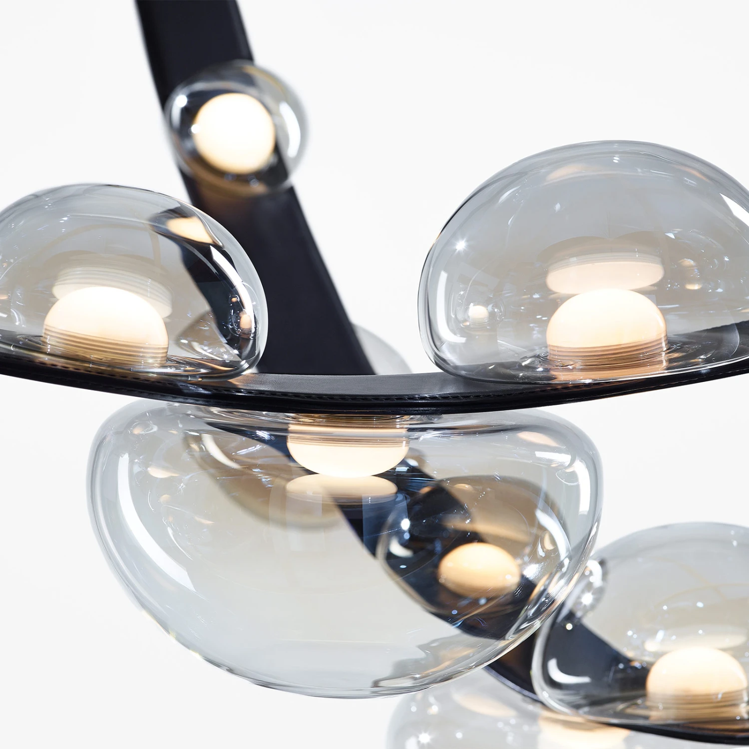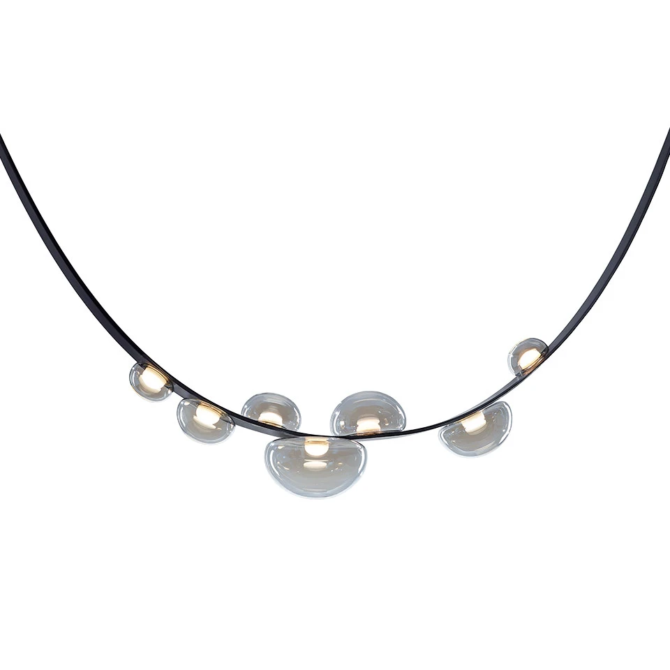 The Dew Drops Pendant is inspired by dew drops sparkling on a thin blade of grass. This fixture features Crystal shades lit by an internal light source offering an exceptional aesthetic experience. Available with Black Leather or Black Vegan Leather. TRIAC, ELV and 0-10V dimming.