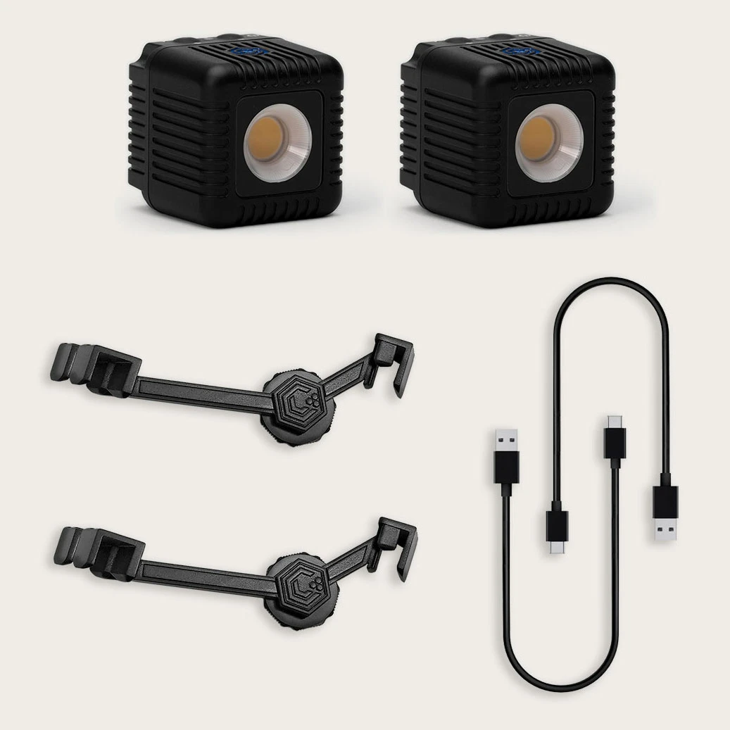 This kit contains two Lume Cube 2.0 lights, two mounting arms, two USB-C charging cables and a protective zipper case.
