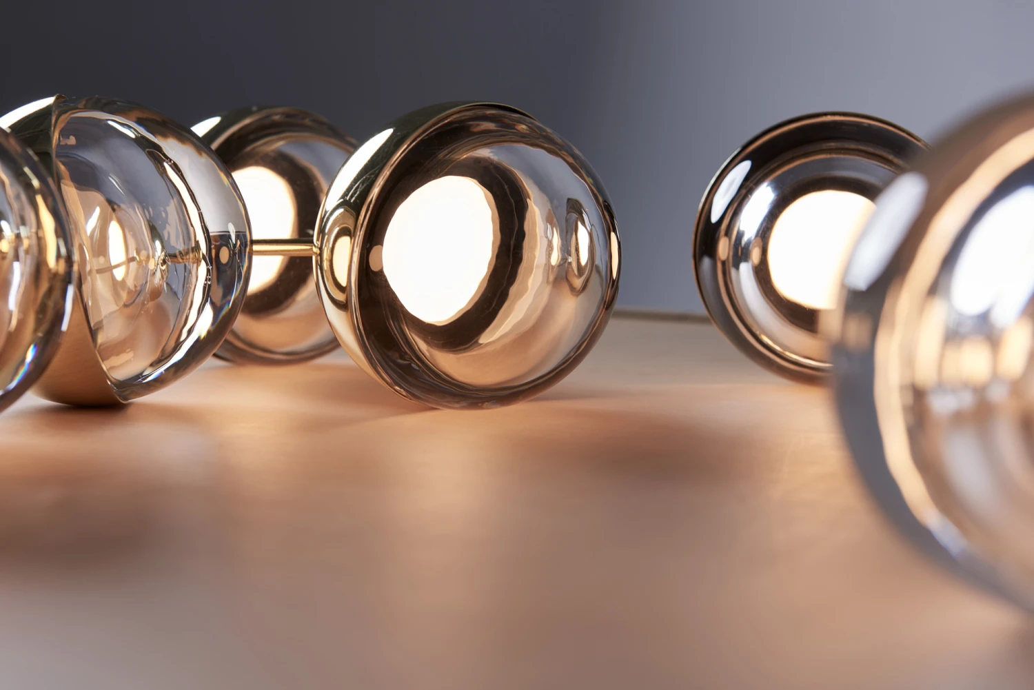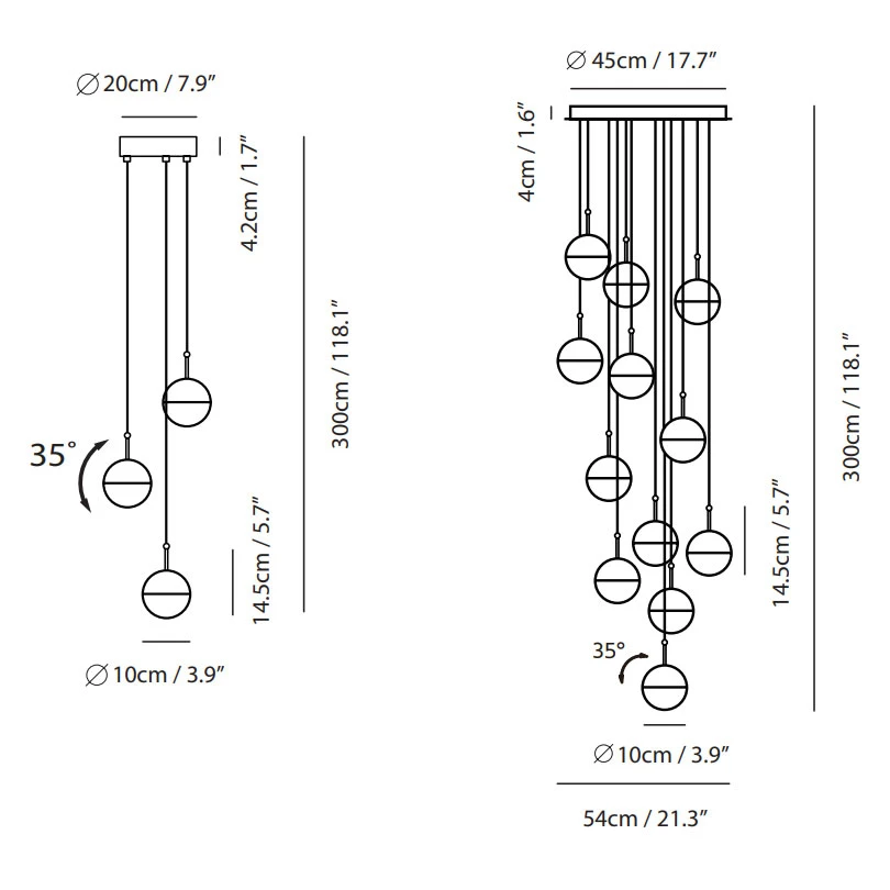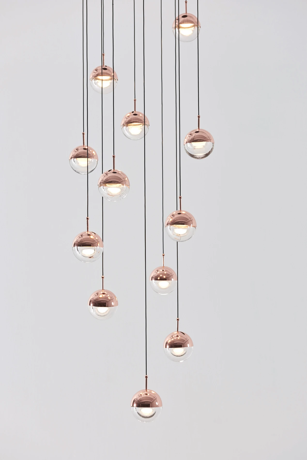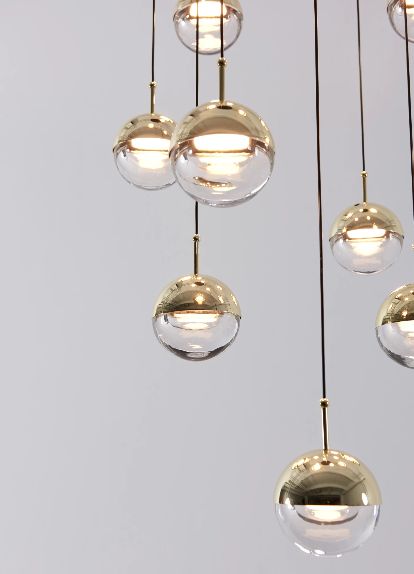 The Dora Multi Light Pendant, designed by Ting, draws inspiration from her childhood, creating a piece that is versatile, interactive, and fun. Features Clear glass with a Copper, Chrome, Black, or Brass top shade that is rotatable up to 35 degrees. Black canopy. Choice of 3 or 12 pendants. Built-in driver. ETL listed.