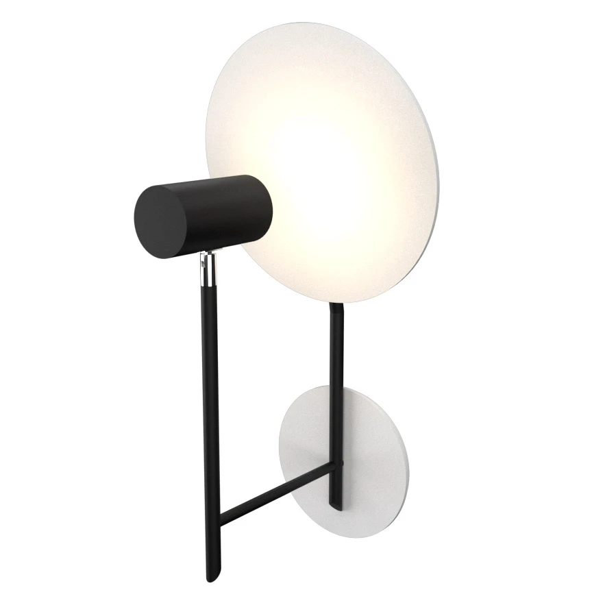 The Dot Wall Sconce features a sleek Matte Black body anchored by a Natural Wood Veneer backplate. This fixture is topped with a large Natural Wood Veneer disk as an optional light deflector. The adjustable Matte Black shade allows this floor lamp to easily convert from task light to ambient light.