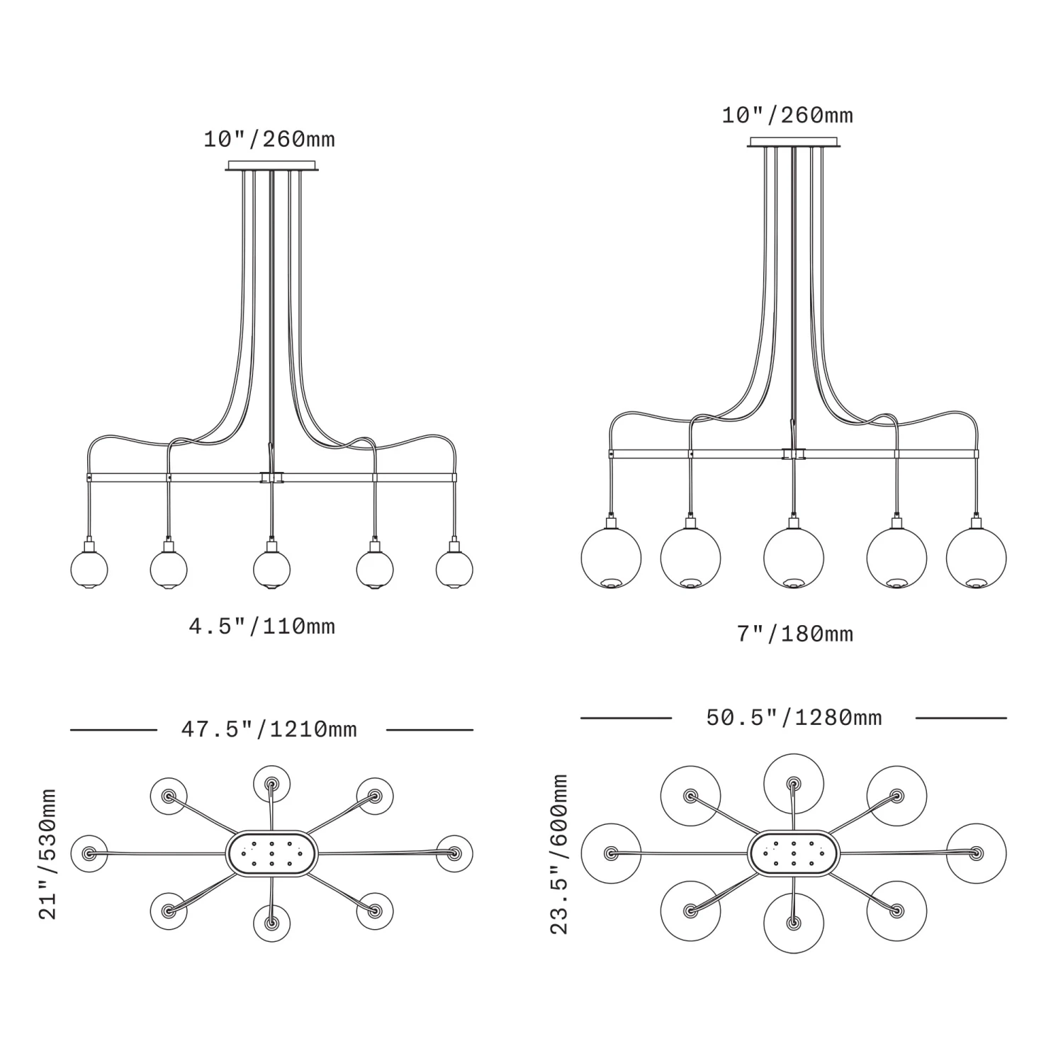 The Drape Arm 8 Linear Chandelier is sophisticated and modern. It features 8 individual pendants suspended in a linear from a 8-spoke frame. The 47.5 inch option features 4.5 inch glass spheres and the 50.5 inch options features 7 inch glass spheres.