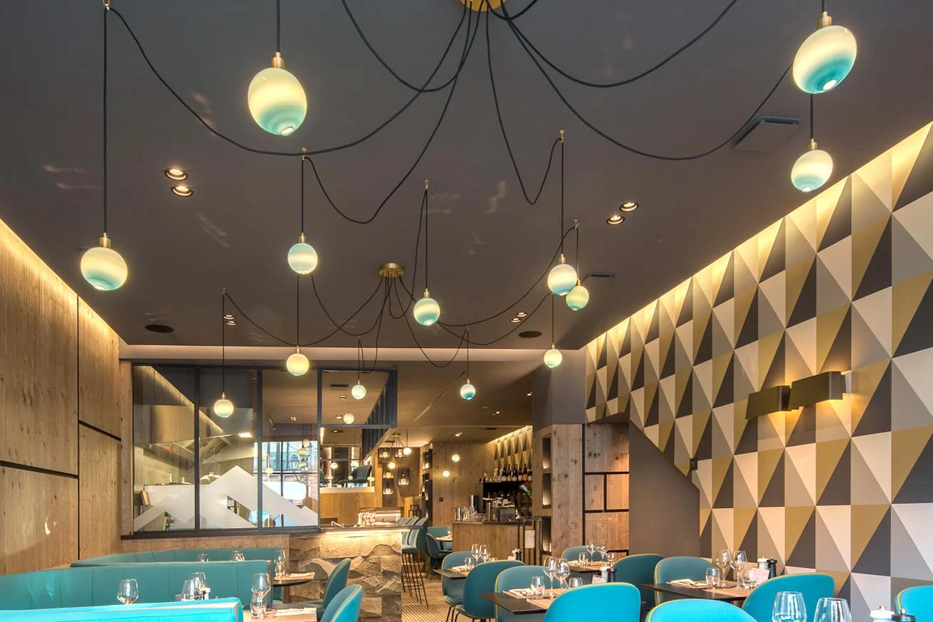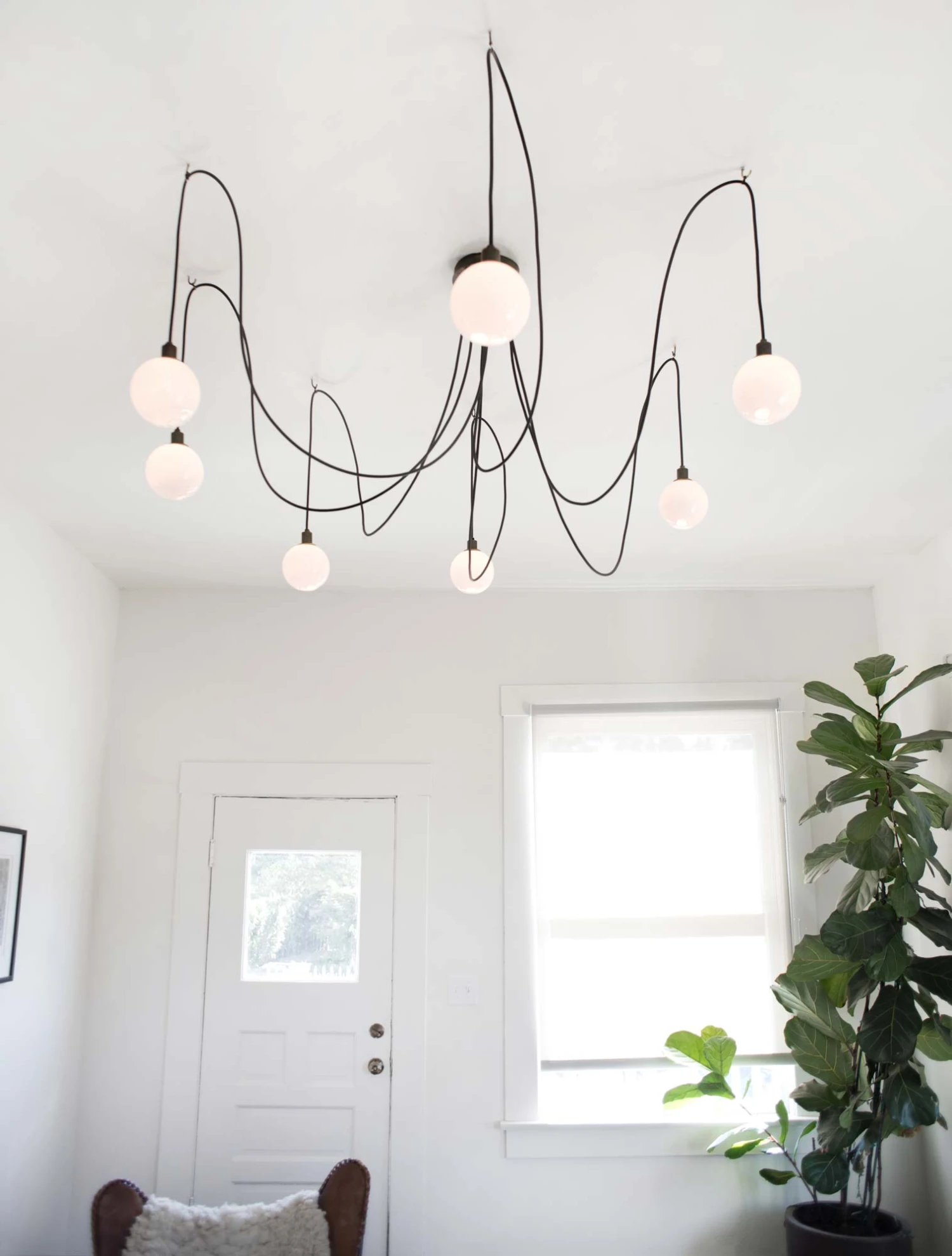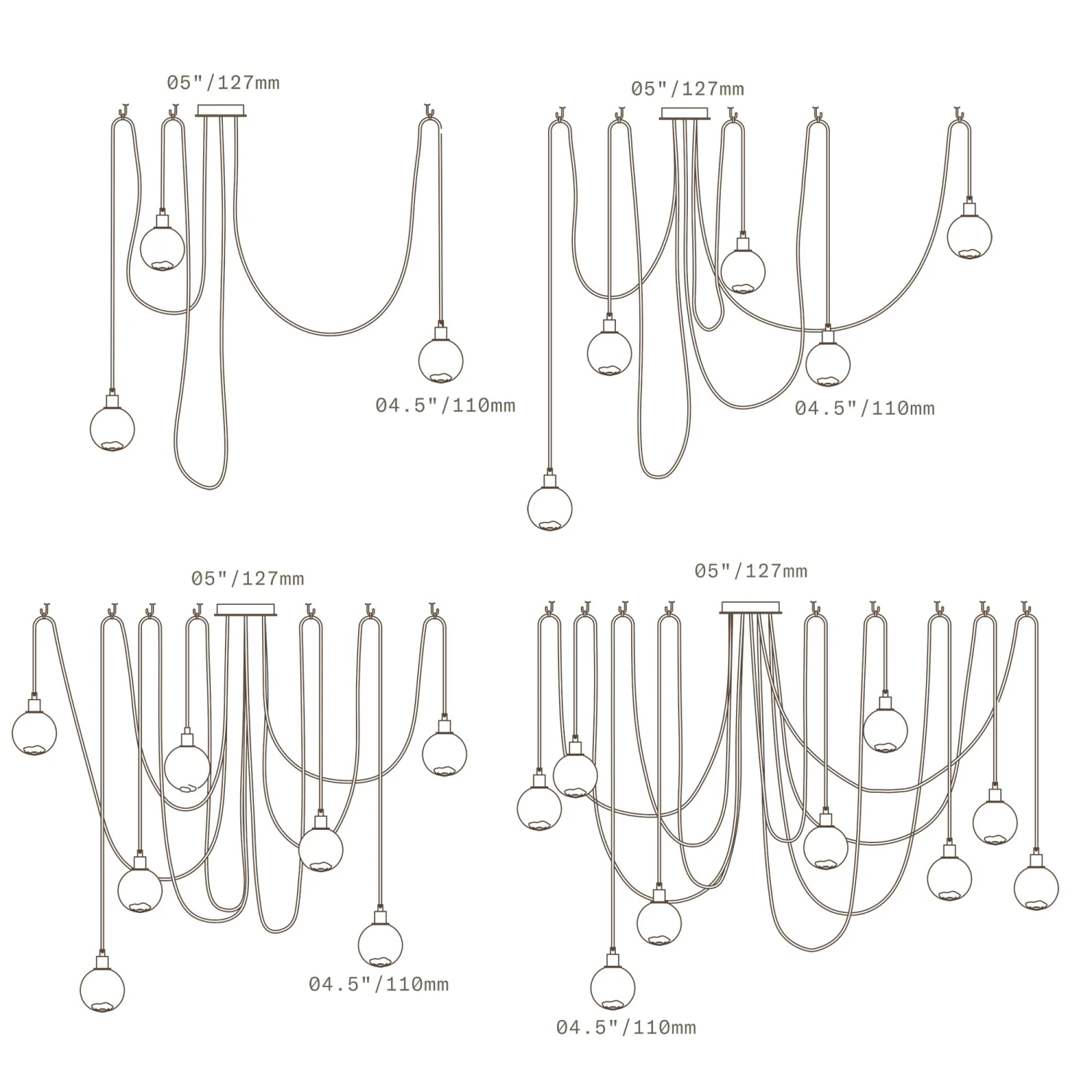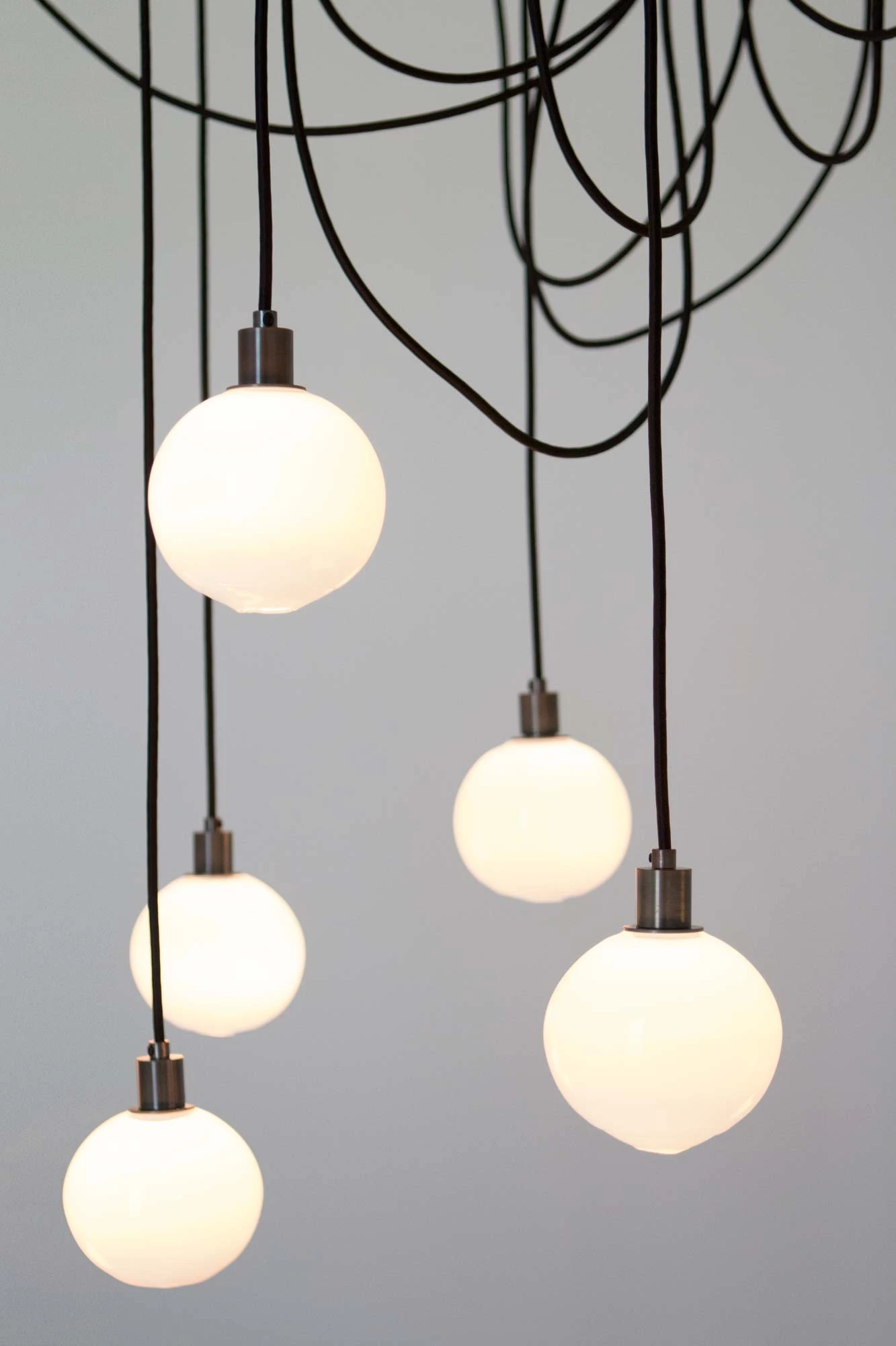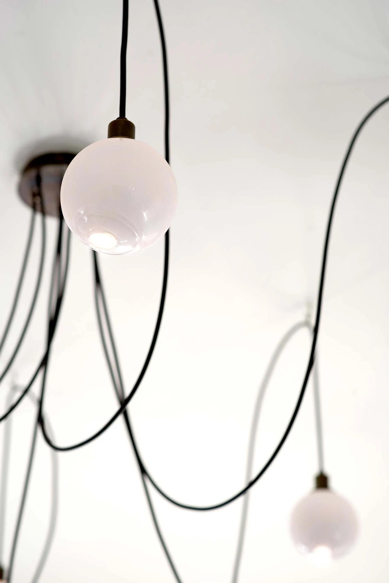 The Drape Hook Pendant brings personality into any space with unlimited customization. Each hand blown Glass sphere pendant hangs from a single canopy and swings out with ceiling hooks that can be uniquely placed. Each sphere has a 4.5 inch diameter.