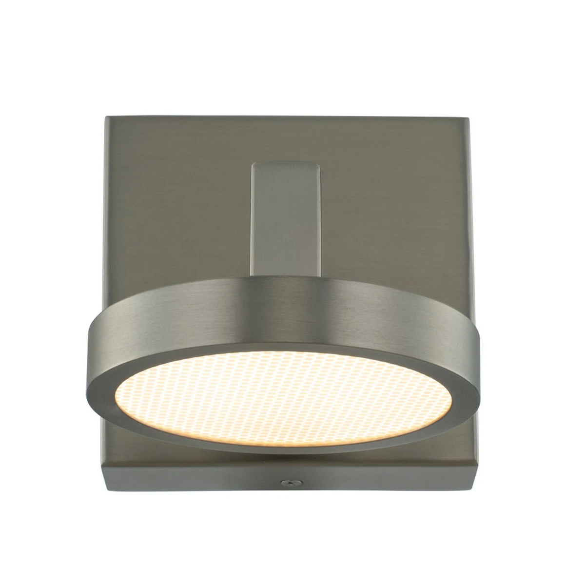 The Eaton Wall Sconce brings a unique, out of this world look to a variety of interior styles. The circular downlight shines perfectly over a mirror. Available with a Satin Nickel finish. Damp location rated. ETL listed.
