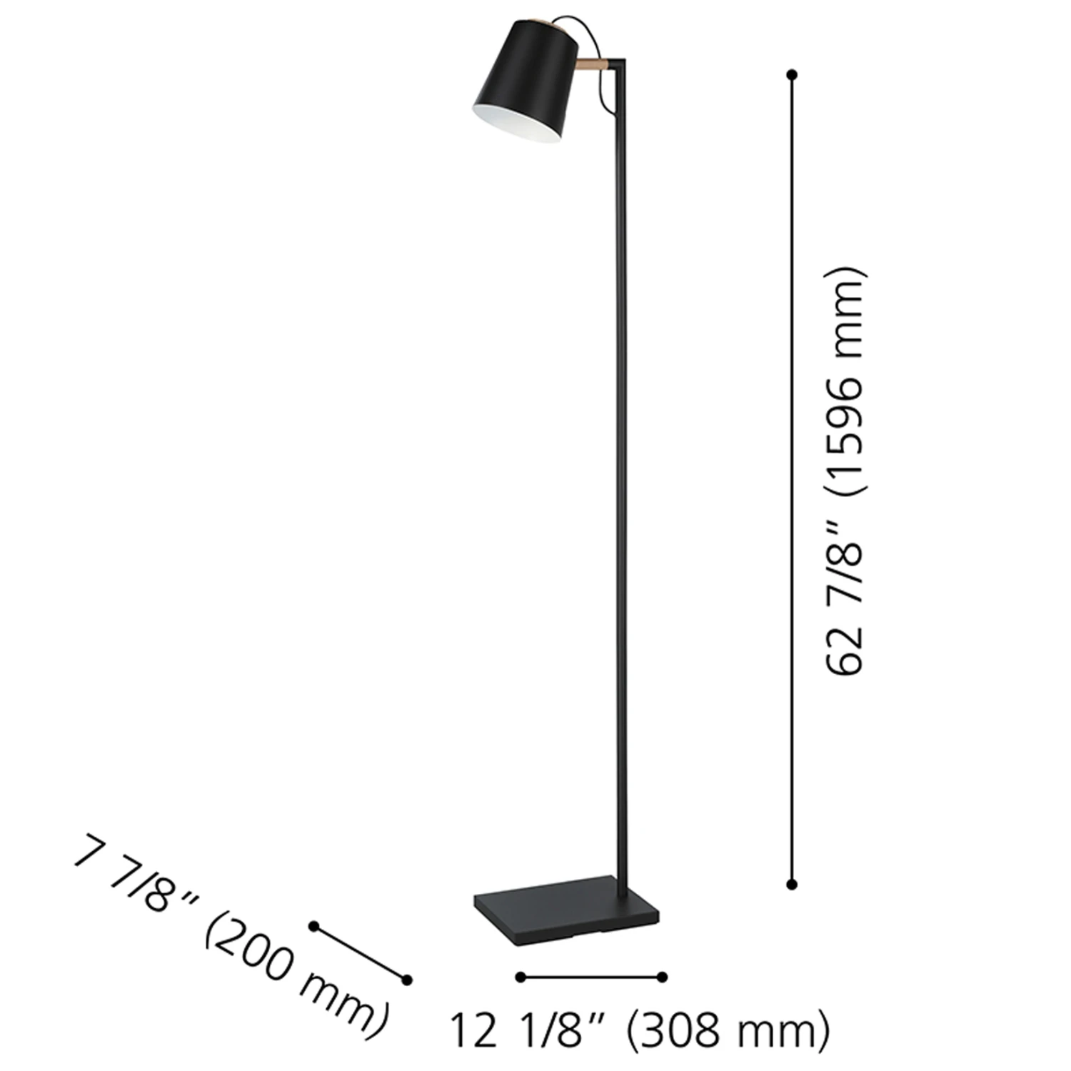 The Lacey Floor Lamp features a structured black finish with a natural wood accent. The metal shade is adjustable and has a structured black exterior and white interior finish. On/off foot switch.