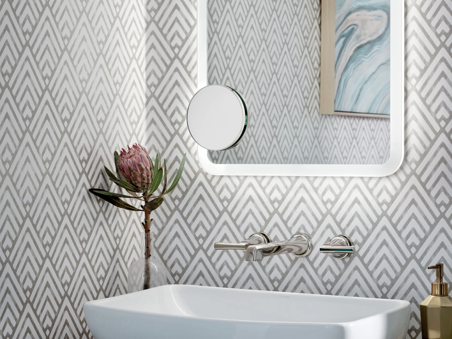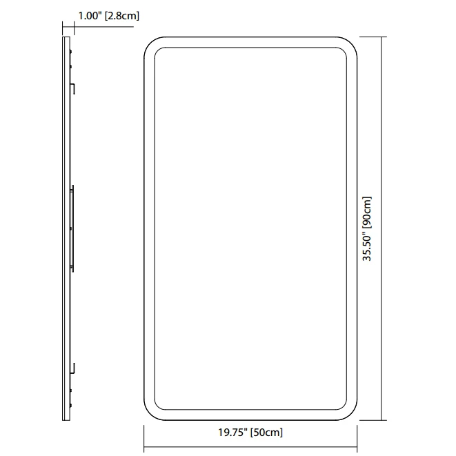 Mirror With 3 inch Edge Lit Etched Acrylic Border features light emanating from behind the mirror, creating a soft illumination through the etched light edge. 6 inch diameter round magnifier mirror included which easily suctions to the mirror for close-up applications. 19.75 inch width x 35.5 inch height x 1 inch depth. Mounts vertically only. ETL listed for damp locations.
