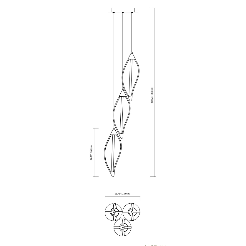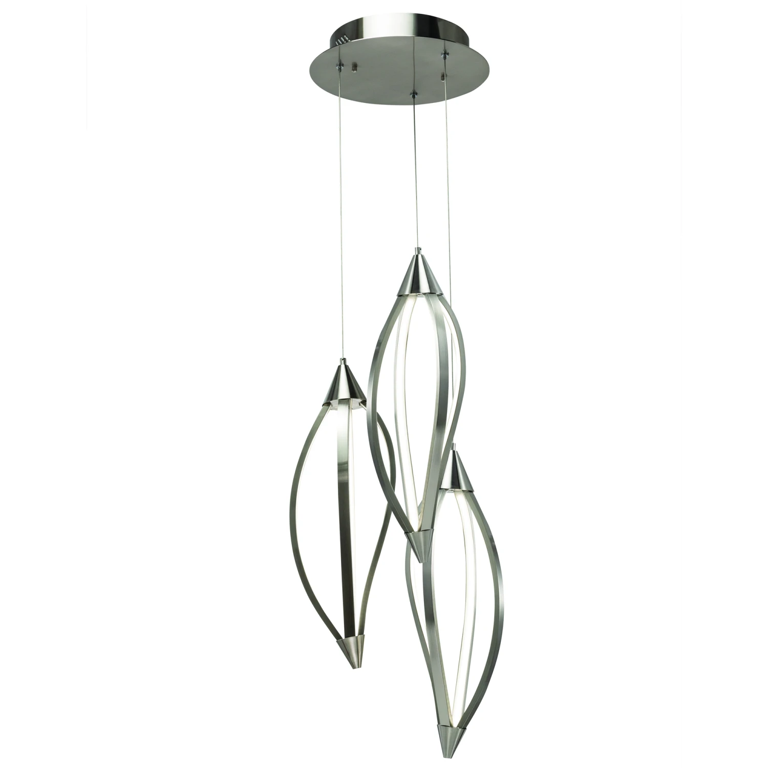 The Meridian Three Light Pendant features a Chrome or Brushed Nickel finish with etched acrylic diffusers. Integrated 38.9 watt 120 volt 80CRI, 3200K LED light source. 28.75 inch width x 22.25 inch height x 108.25 inch maximum length. ETL listed.