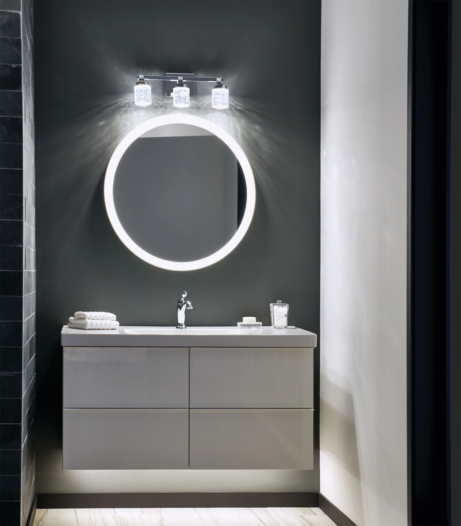 The Ryame Round Lighted Mirror provides a soft halo of light glowing around the perimeter of the mirror finished in Matte Black or Matte Silver with Frosted diffusers. Dimmable with ELV dimmer. Recommended: Legrand Adorne SofTap dimmer ADTP703TUW4 or Leviton Decora SureSlide dimmer 6615-POW, sold separately. ETL listed.