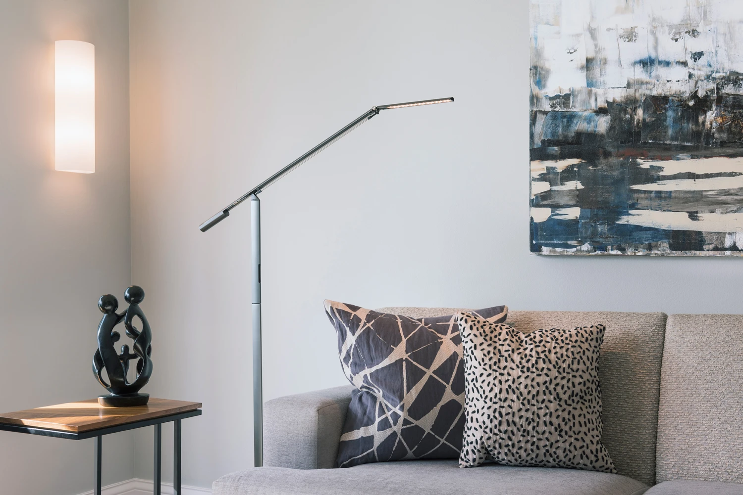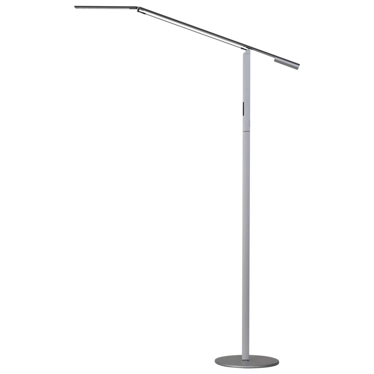 The Equo LED Floor Lamp 3500K or 4500K features a discreet counterweight design for feather-light adjustability. One finger is all you need to adjust the floating arm’s position. The special neck joint maintains the head’s tilt as the arm swings up or down. Slide your finger along the stem’s touch strip to control brightness and power. The head rotates 180 degrees. Available in Black, Orange, Silver, or Chrome. Includes 9 foot cord. 85 CRI. Rated average life of 50,000 hours. Includes 28 LED modules totaling 6 watts. 10 inch width x 44.75-56.75 inch adjustable height. UL listed.