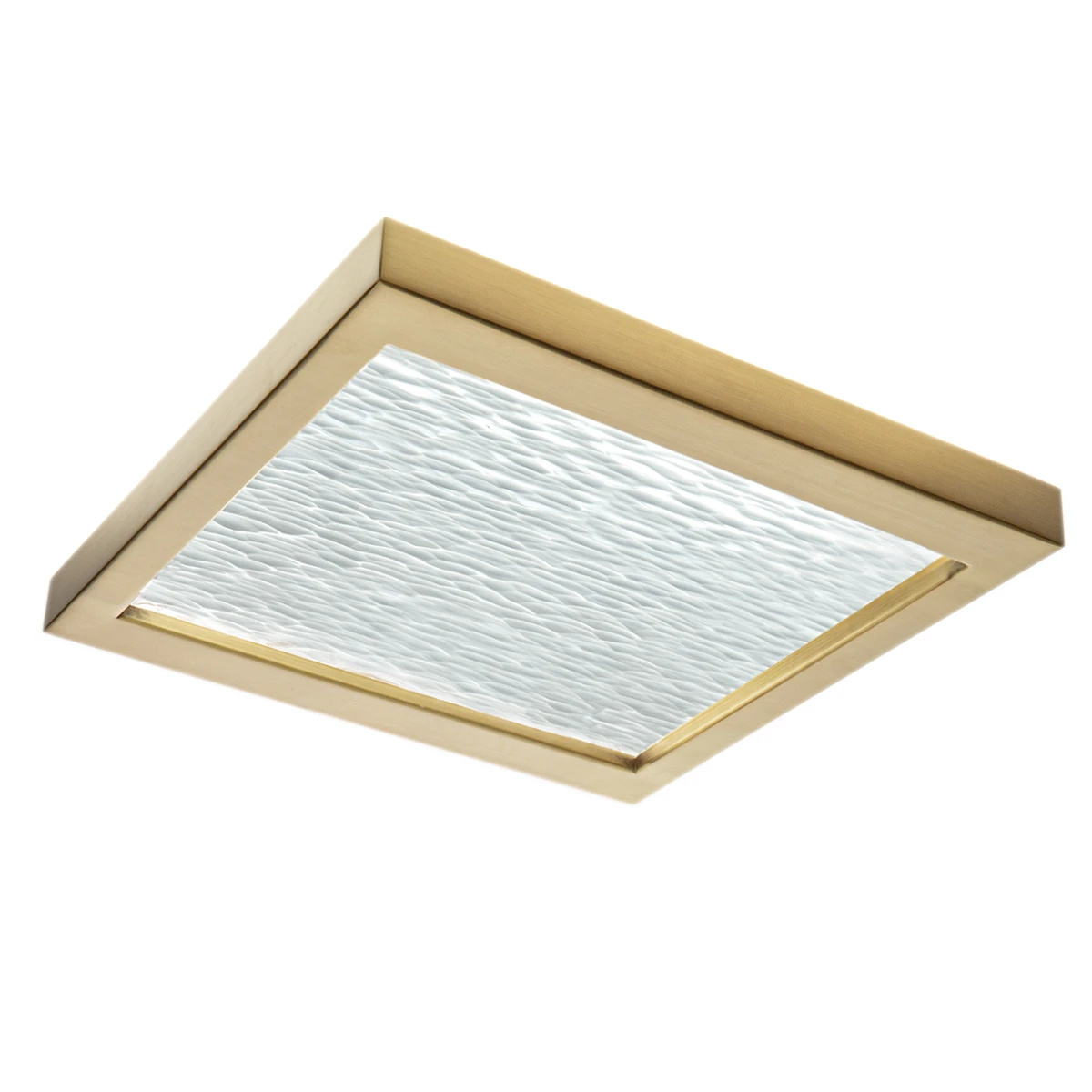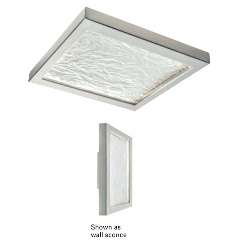 The For Square Flush Ceiling Light features a White Resin Acrylic diffuser. Available with a Brushed Nickel finish and diffuser with a paper wrinkle pattern texture or Satin Brass finish and wave pattern texture. UL listed for Damp location.