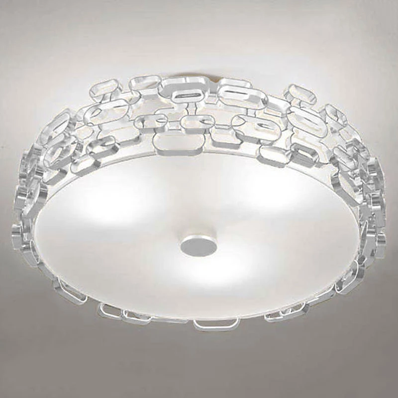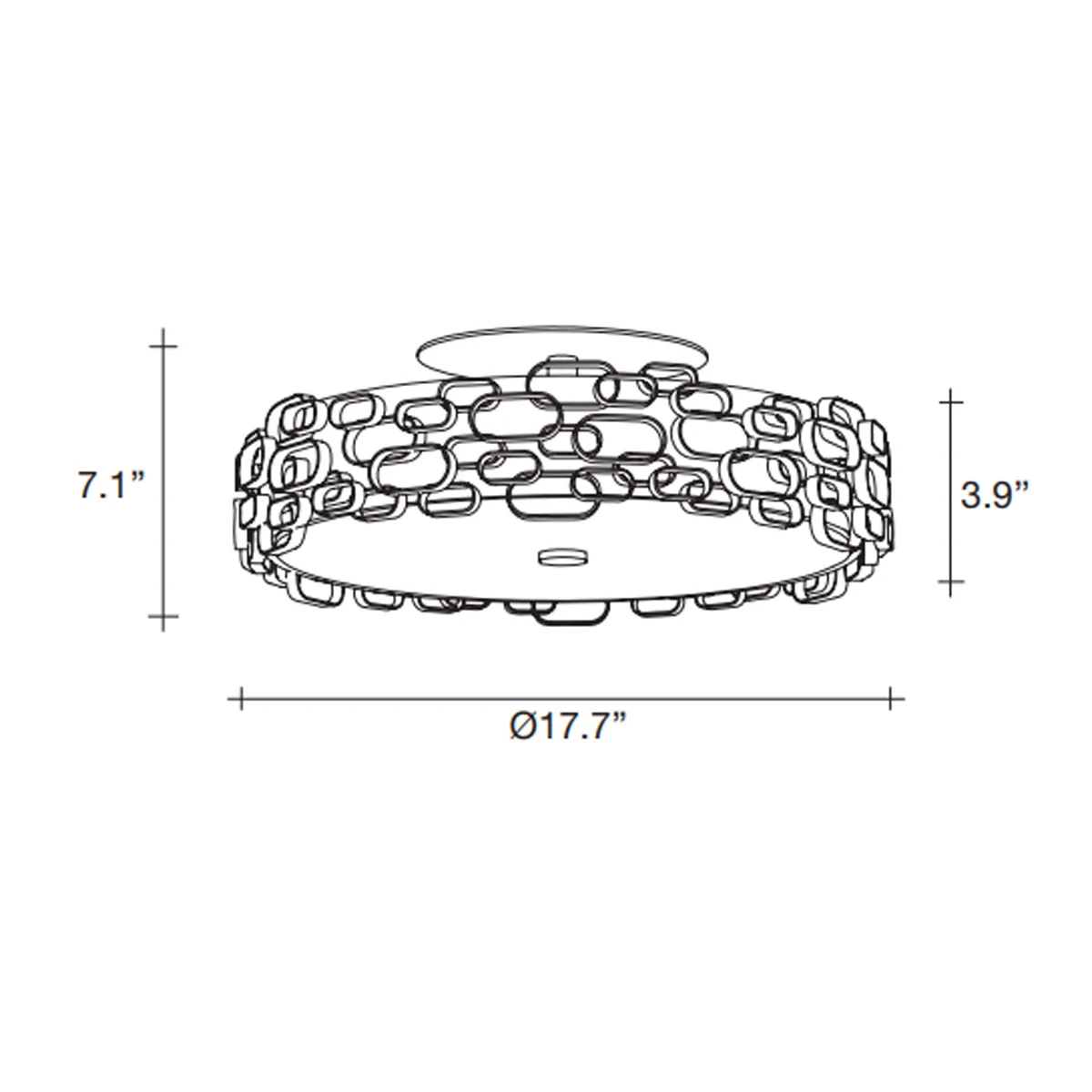 The Glamour Flush Mount Ceiling features random geometric rings available in Nickel, White or Gold plated finish with a white opaline glass diffuser. ETL listed.