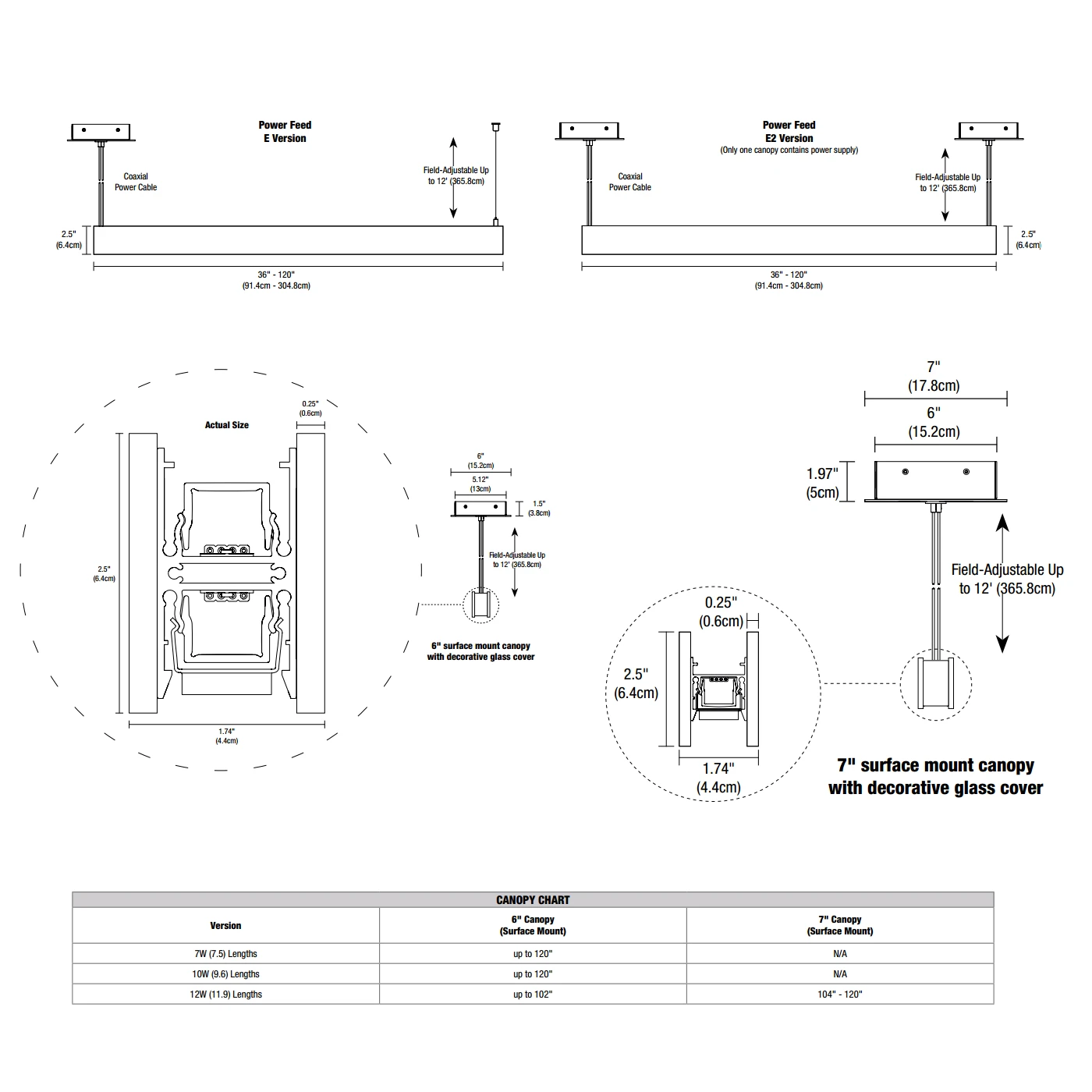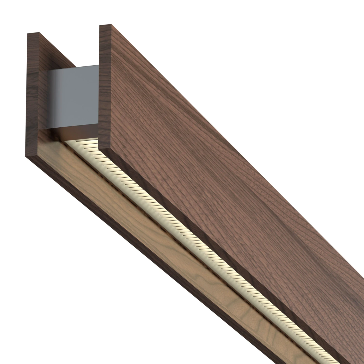 Glide Wood Up/Down End Feed Suspension is a linear LED fixture that offers direct and indirect light in a clean, contemporary style. Available with one or two canopies. Downlight features a diffused white lens with 100 degree beam spread and optional black or white louvers for adjustability. Uplight features a clear frosted 60 degree lens. Available in seven color temperature options. Channel widths sold in 12 inch increments from 36 to 120 inches with 7 (2 watts up/5 watts down), 10 (5 watts up/5 watts down), or 12 watts (5 watts up/7.5 watts down) per foot. Supplied with 12 feet of adjustable coaxial cables (fixtures exceeding 96 inch include additional aircraft cables). 120 volt input, 24VDC Class 2 output, electronic low voltage LED power supply included in canopy. Dimmable with an electronic low voltage dimmer: (Lutron Diva DVELV-300P, Lutron Skylark SELV-300P, Lutron Maestro MAELV-600 and Lutron Radio Ra 2, or Legrand Adorne ADTP703TU), sold separately. Uplight and downlight can be individually dimmed using two electronic low voltage dimmers. 5 year warranty. Product is built to order.