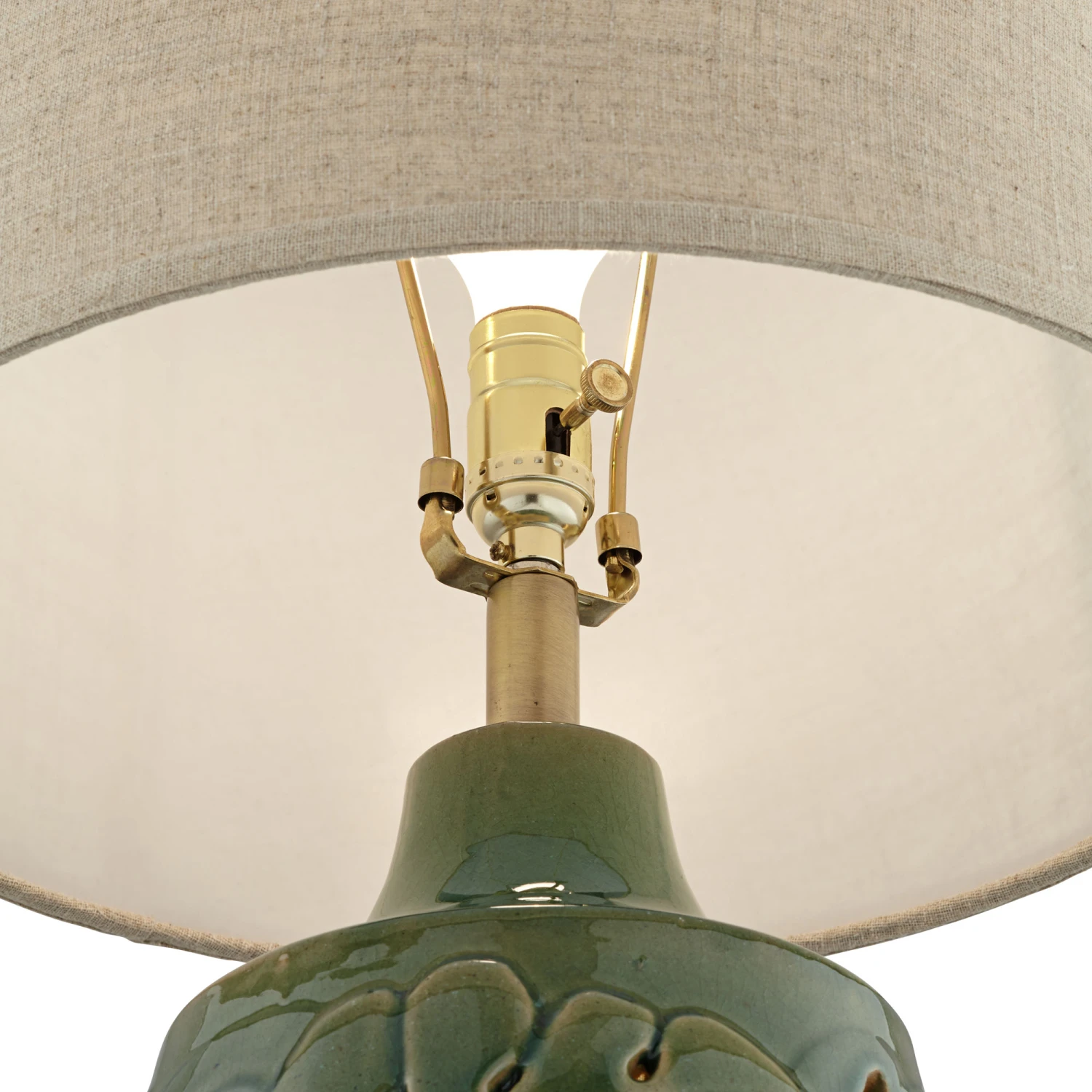 The Green Leaves Table Lamp features a ceramic base with a deep green hue and monstera leaf details. Cutouts in the base allow light from an included LED nightlight to shine through. An oatmeal linen shade tops the lamp to complete the organic look. On/off rotary switch located on socket.
