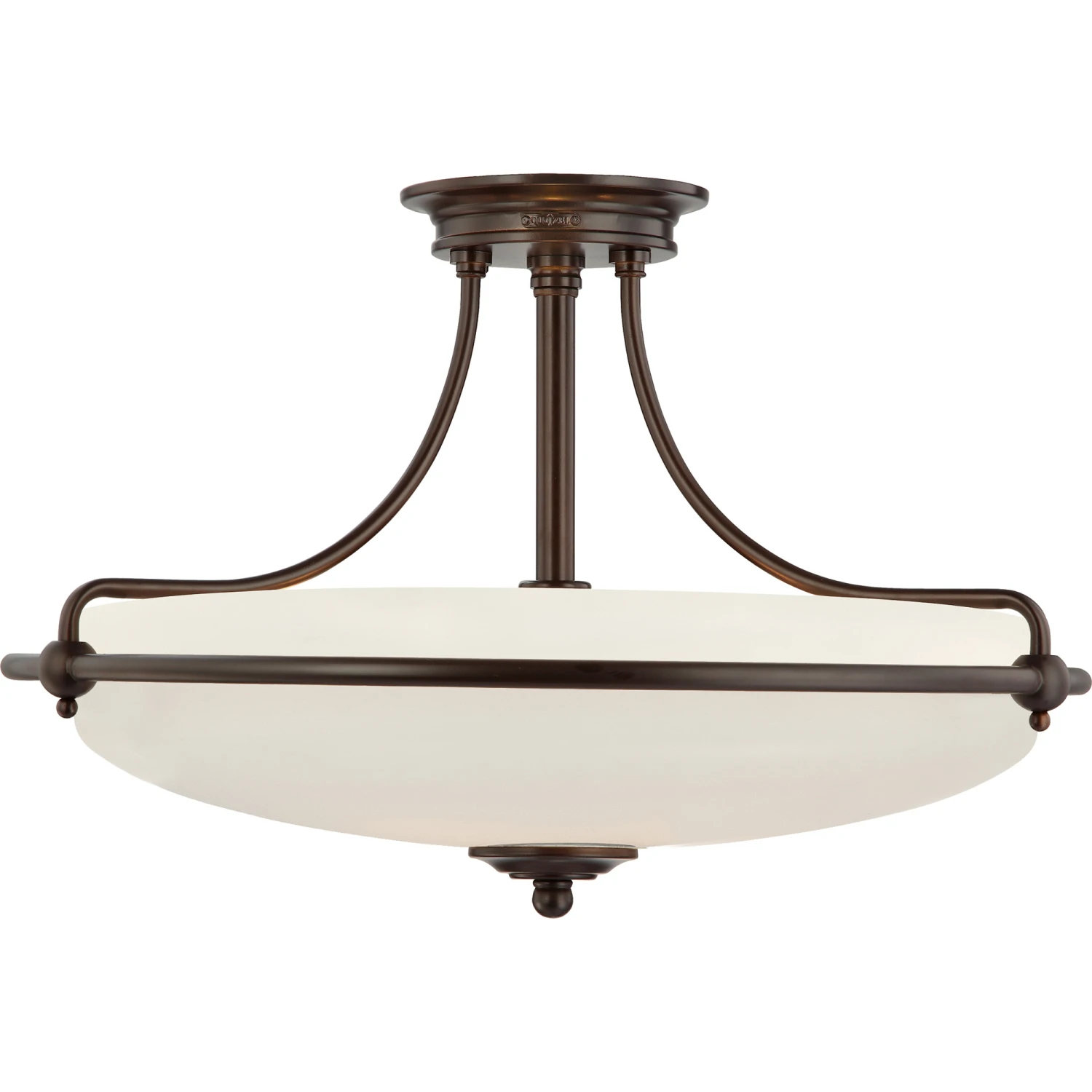 Griffin Ceiling Semi Flush Light is an understated style that provides a stylish soft modern look in any room. The etched shade is painted White on the inside, diffusing light evenly and illuminating your room with a soothing glow. It is held in place softly by curved arms in Antique Nickel or Palladian Bronze. Available in small and large sizes. 60 watt 120 volt A19 medium base bulbs are required, but not included. ETL listed for damp locations. Small: 17 inch width x 12 inch height. Large: 21 inch width x 14 inch height.