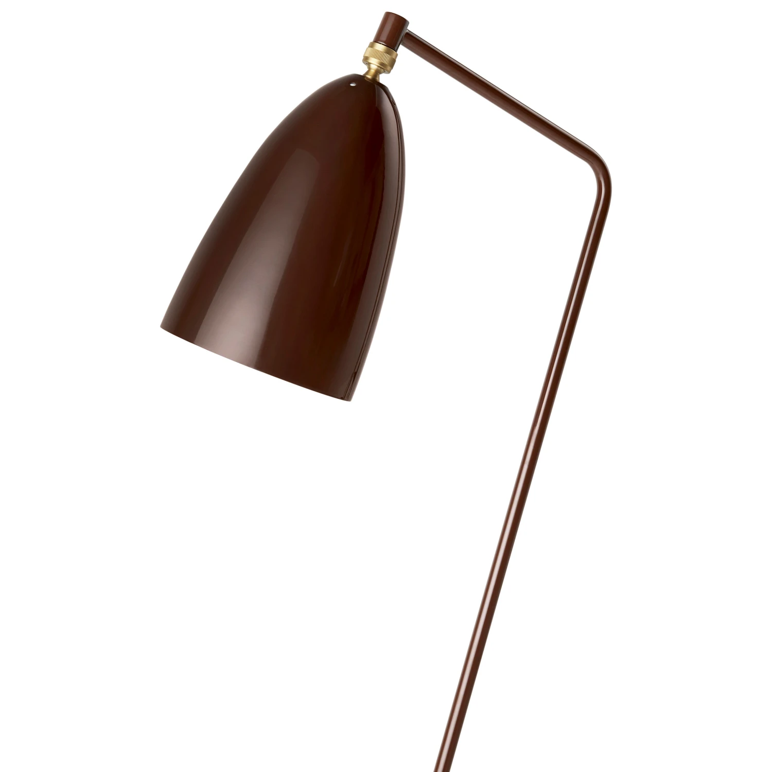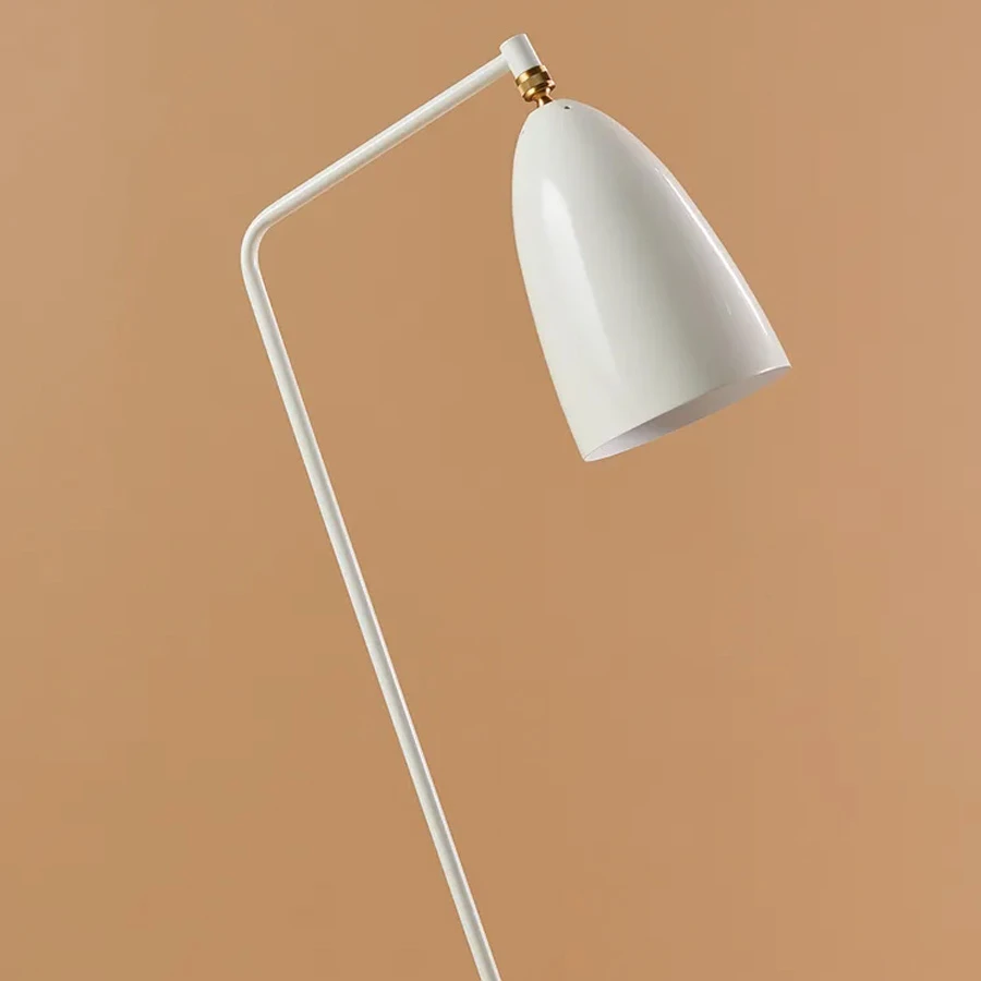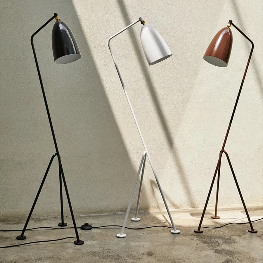 The Grashoppa Floor Lamp, first produced in 1947, features a tilted tubular steel tripod stand and an elongated aluminum conical shade ball-jointed onto the arm, allowing the light to be directional. On/Off foot switch located on cord.