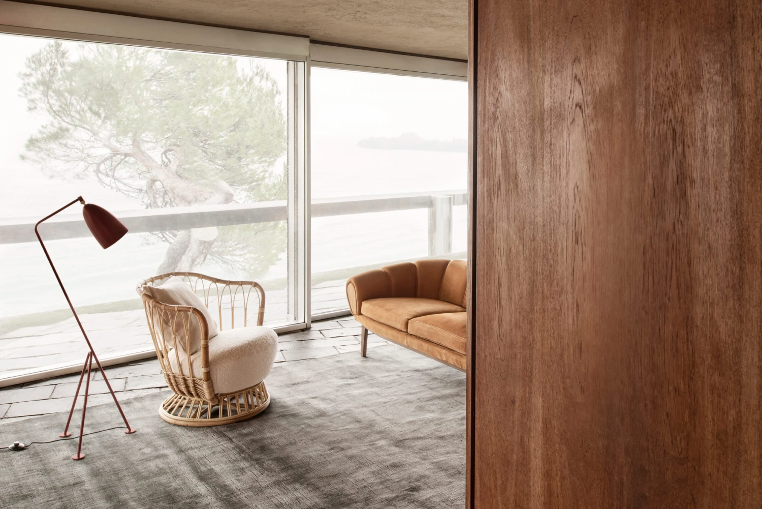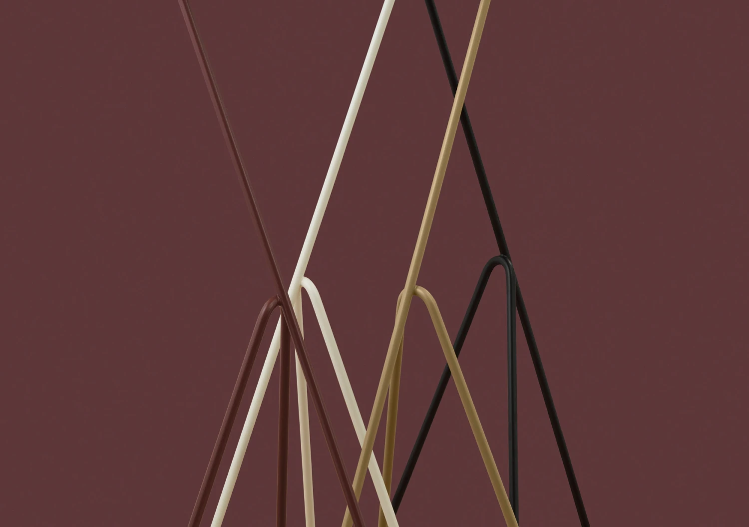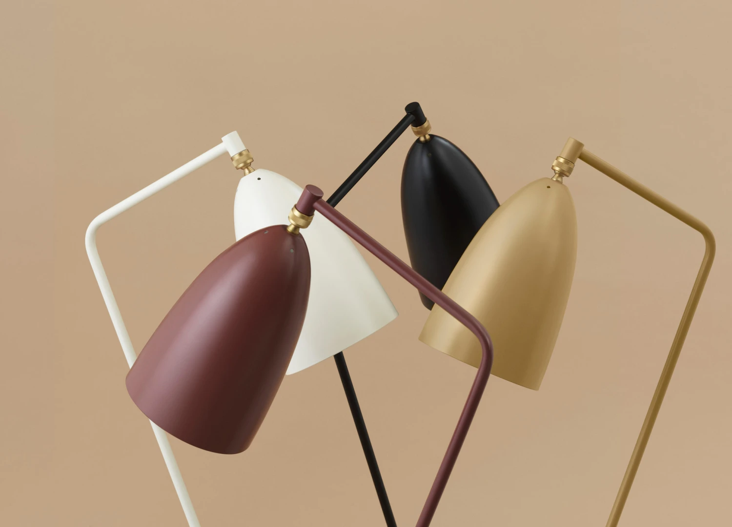 The Grashoppa Floor Lamp, first produced in 1947, features a tilted tubular steel tripod stand and an elongated aluminum conical shade ball-jointed onto the arm, allowing the light to be directional. On/Off foot switch located on cord.