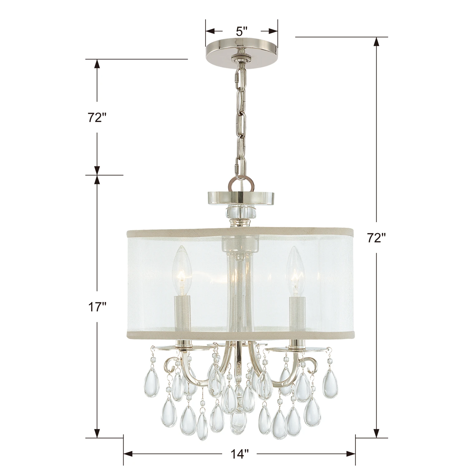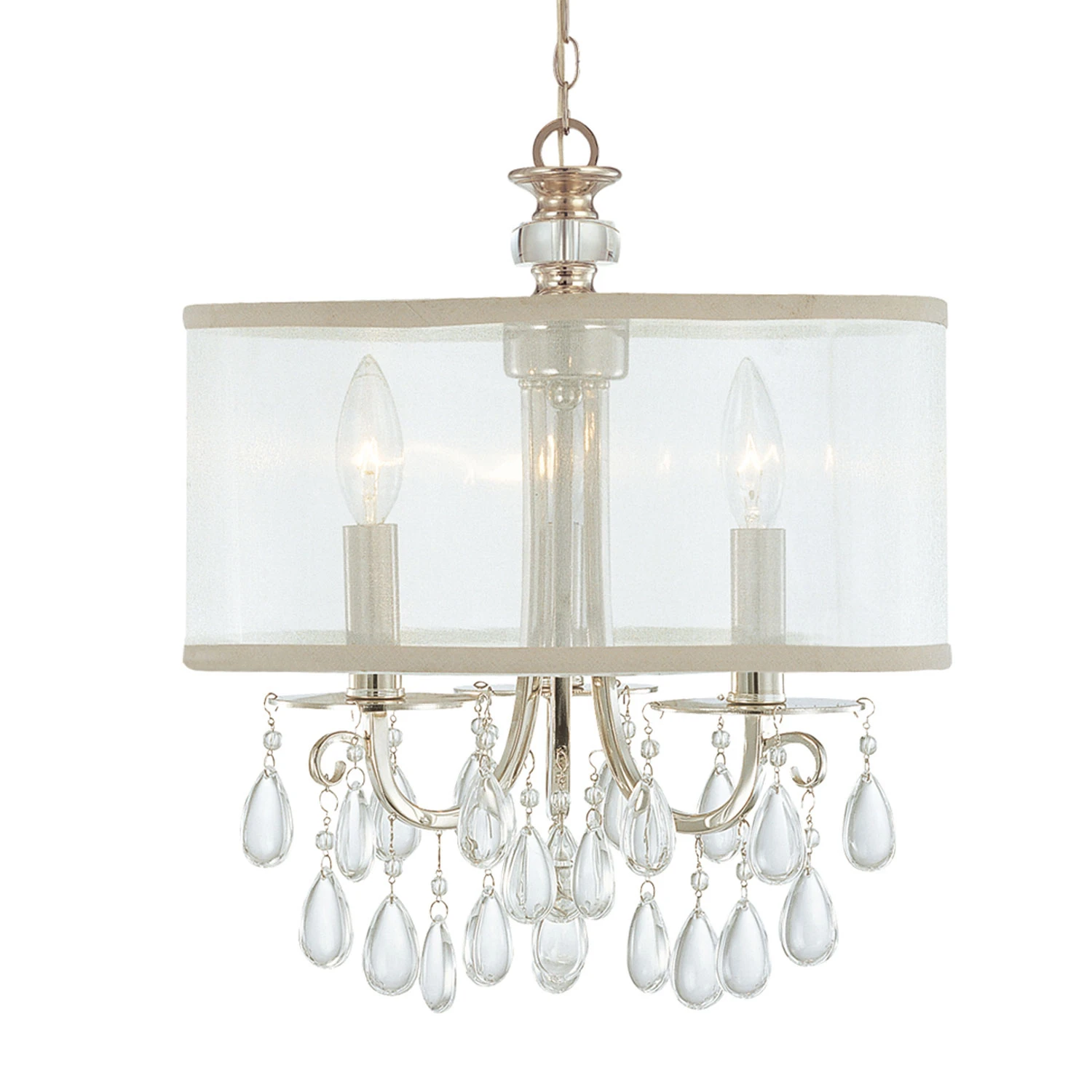 The Hampton Convertible Chandelier adds a classic beauty to your interior space. The curved frame is draped with teardrop shaped crystals and complemented by a sheer shade. Can be converted from a chandelier to a semi-flush ceiling mount. Canopy: 5.1 inch diameter.