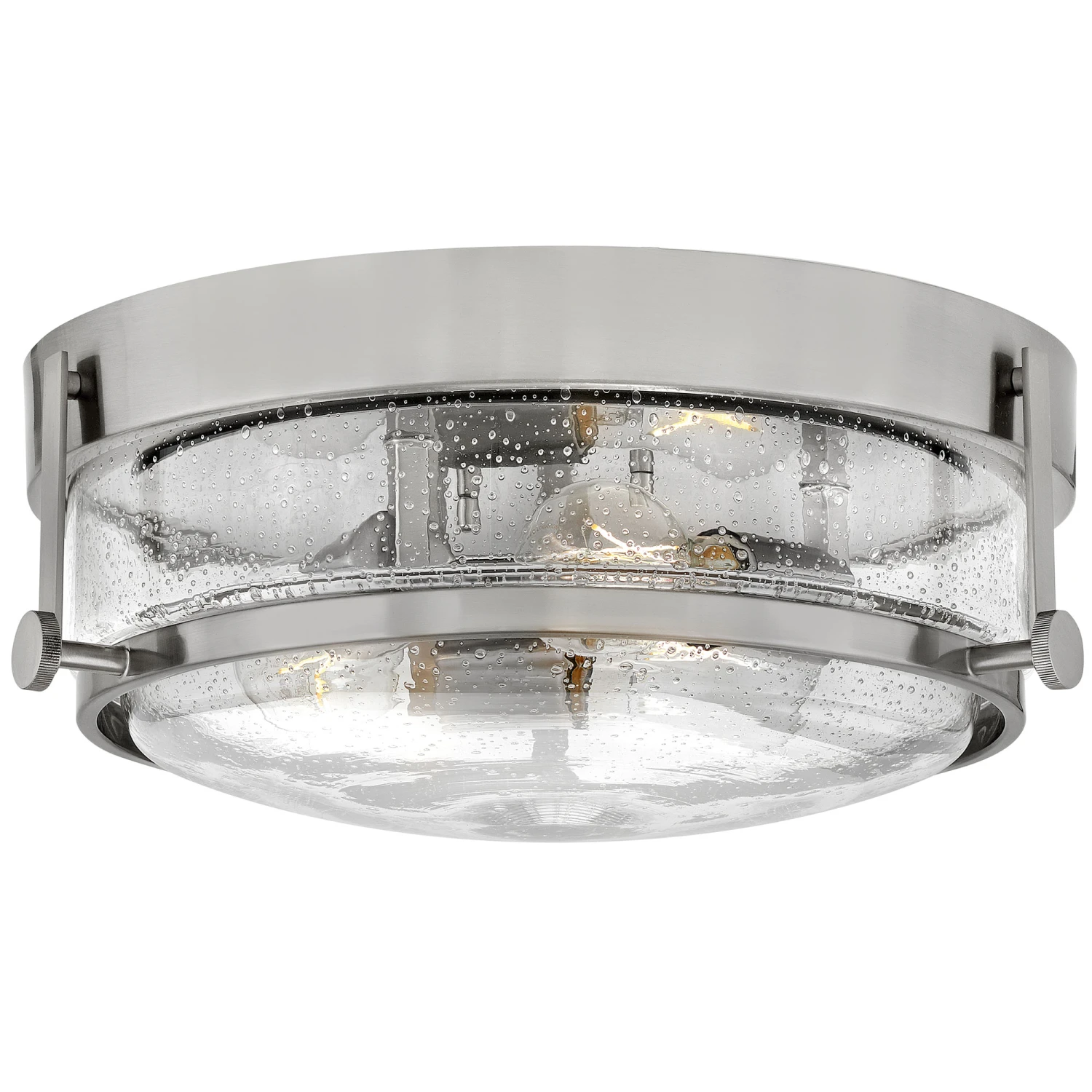 The Harper Ceiling Light’s sleek, retro design elevates the traditional flush mount with a unique clear seedy glass bound by a prominent metal ring and decorative knobs available in five classic finishes.